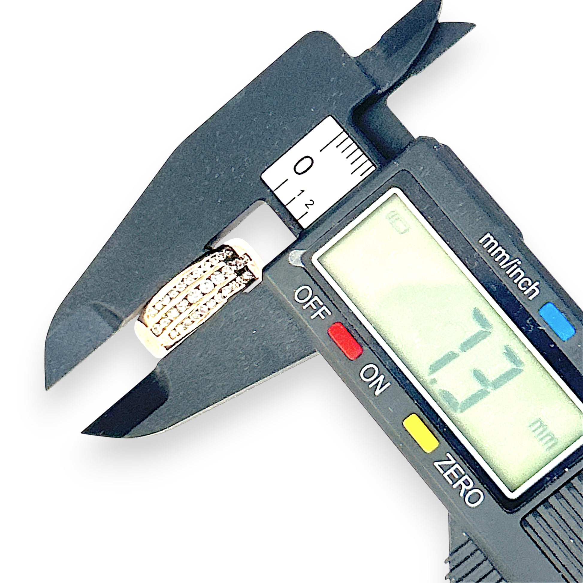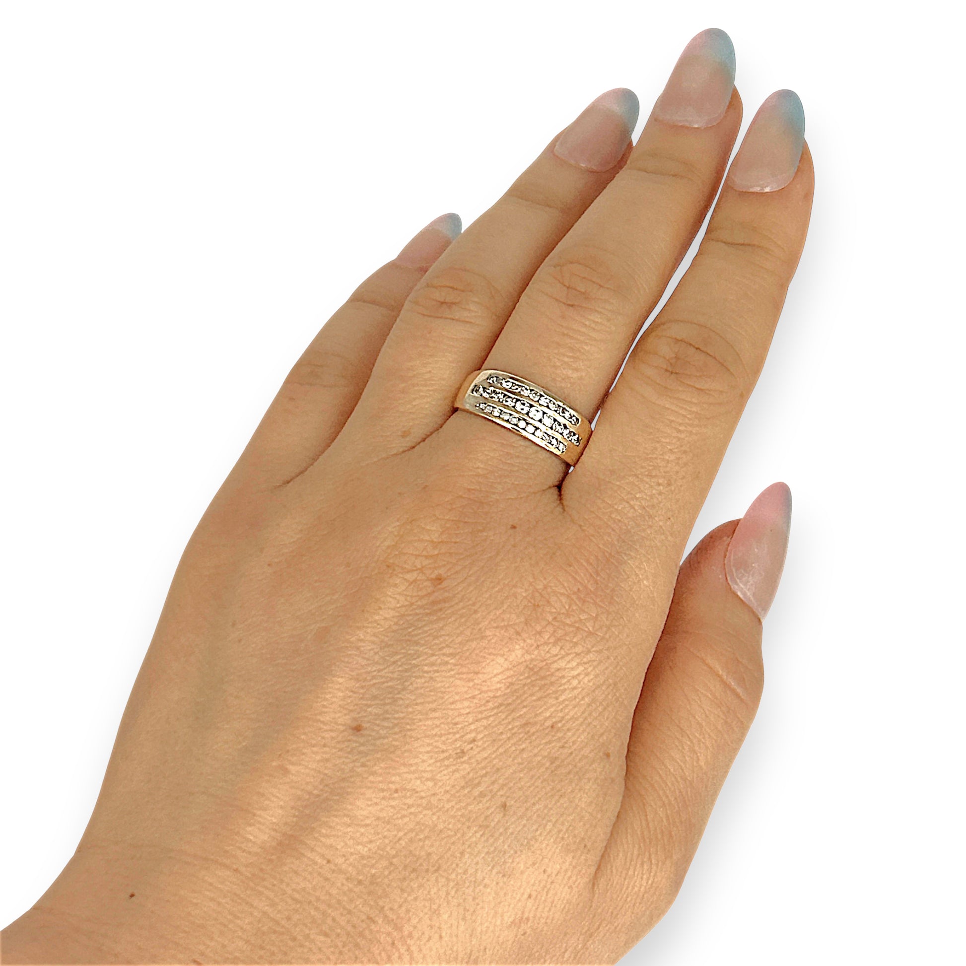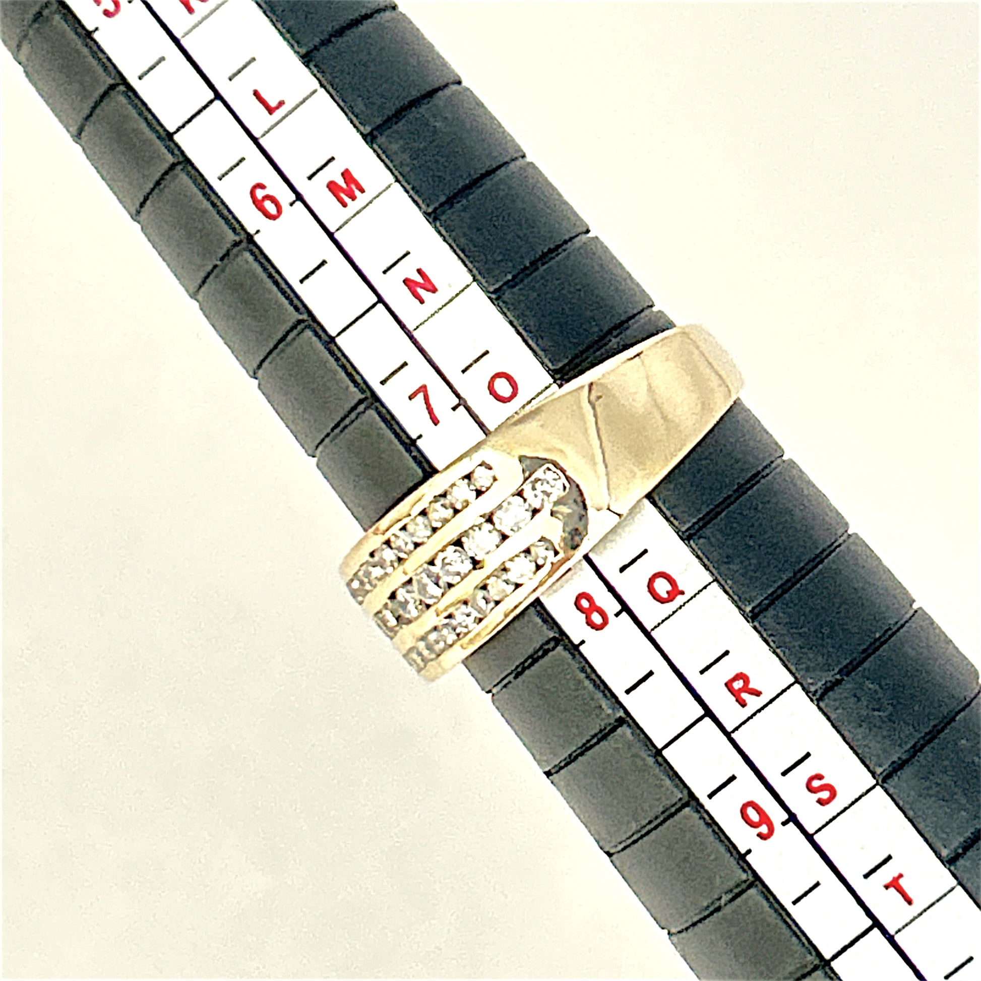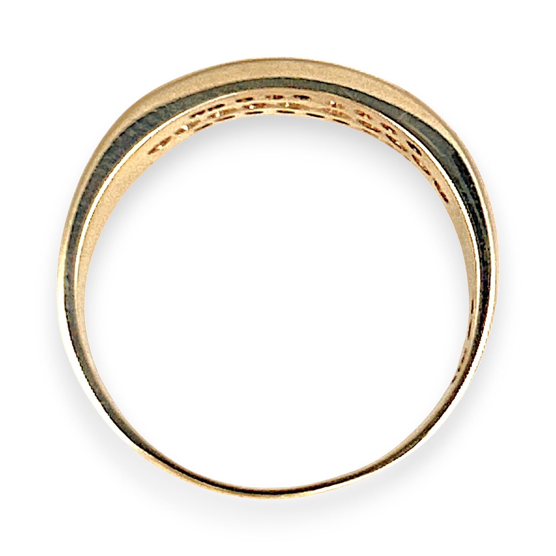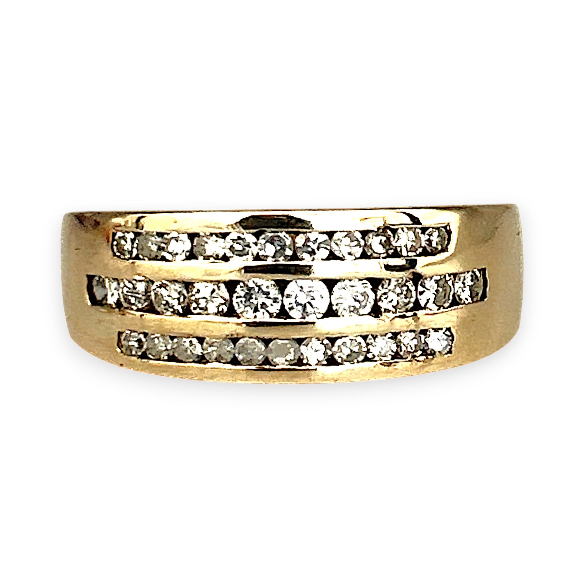 This graceful 9ct gold ring features three fine rows of round-cut diamonds set in a sleek channel design. It offers refined sparkle without overwhelming the hand. Sized P and crafted for everyday elegance, it’s a timeless piece with a delicate, polished finish.