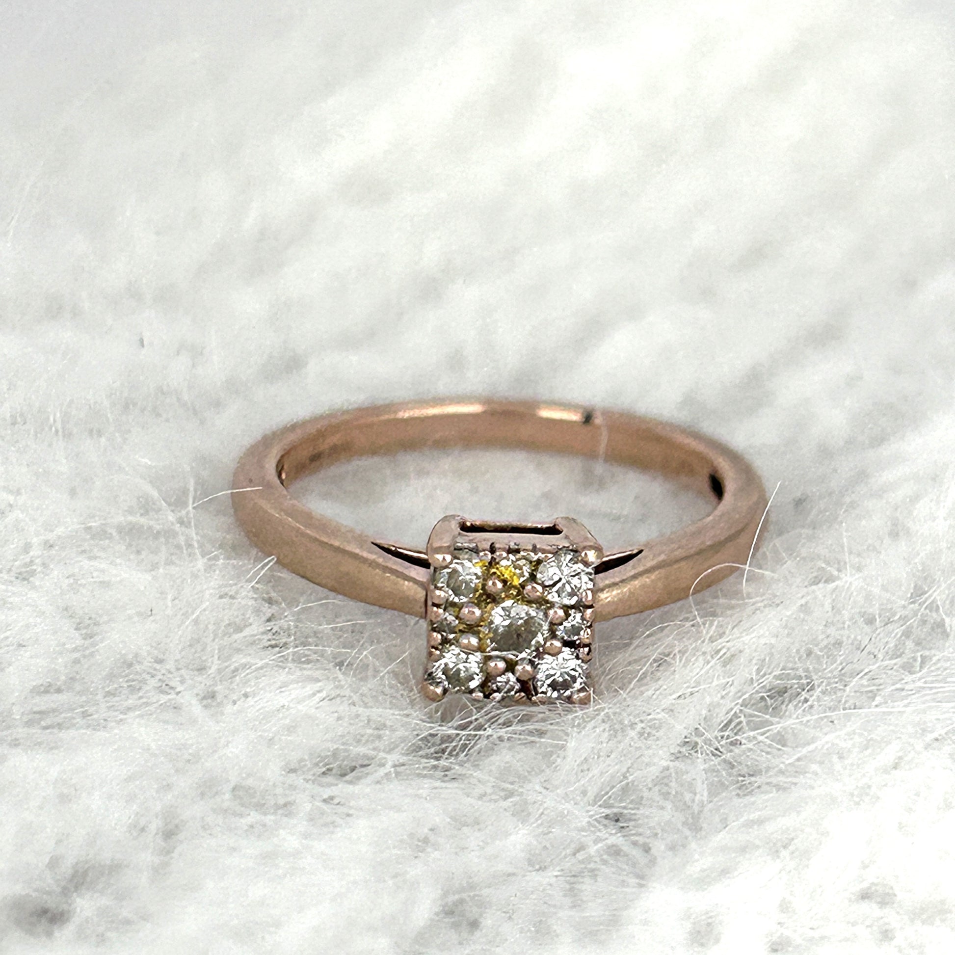 Elegant and radiant, the Rosé Luxe Ring is crafted in 10k rose gold and features a striking square-shaped cluster of round diamonds at its center. The diamonds, with subtle variations in hue, create a warm, shimmering effect that complements the polished rose gold band. A timeless piece that blends classic charm with modern sophistication.
