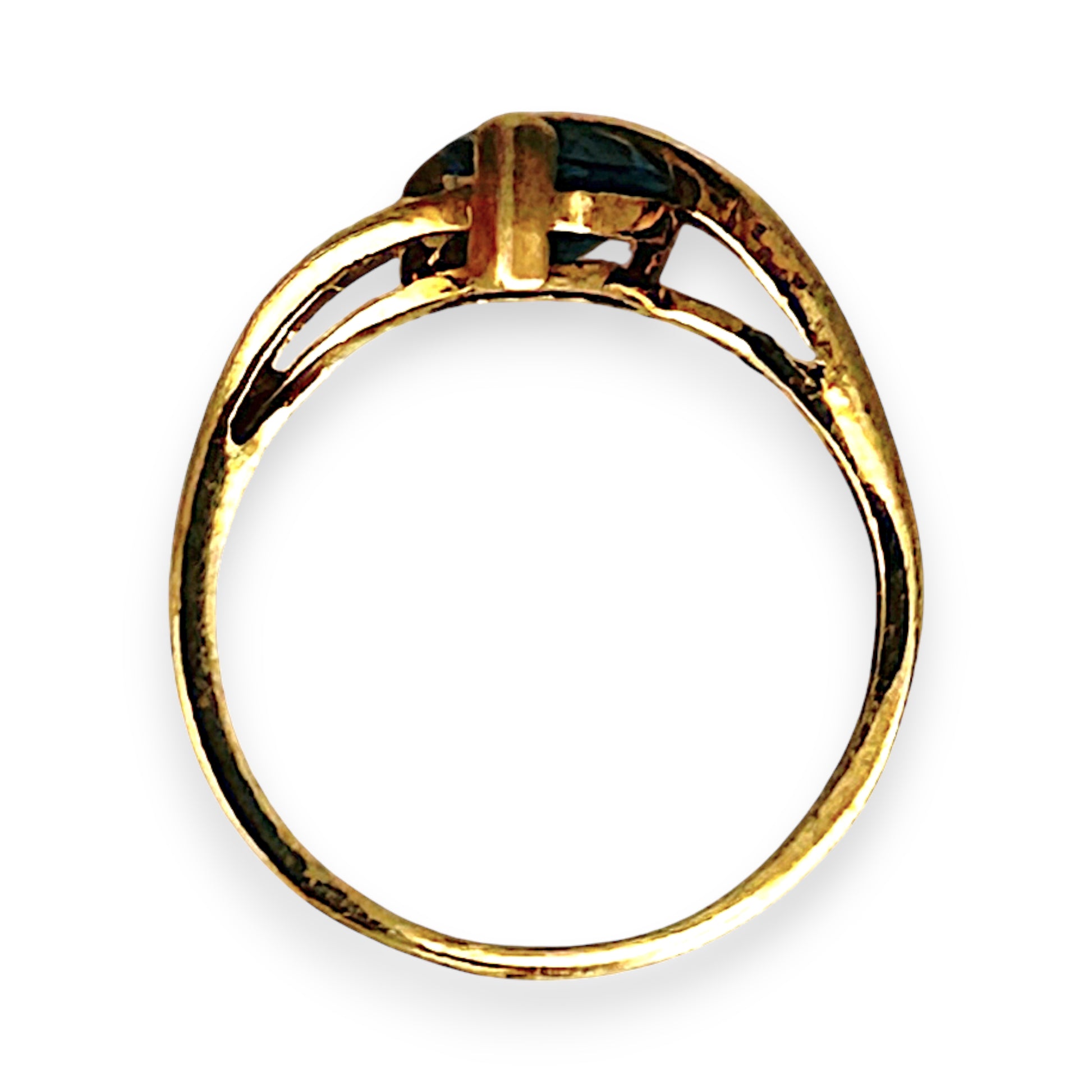 Striking and sculptural, this 9ct gold ring features a vivid triangular-cut blue topaz cradled in an asymmetrical band that flows with modern elegance. One side of the band is adorned with a shimmering row of clear accent stones—likely diamonds—adding brilliance and contrast to the bold geometry of the central gem. The combination of rich gold, vibrant blue, and sparkling accents creates a piece that’s both contemporary and timeless..