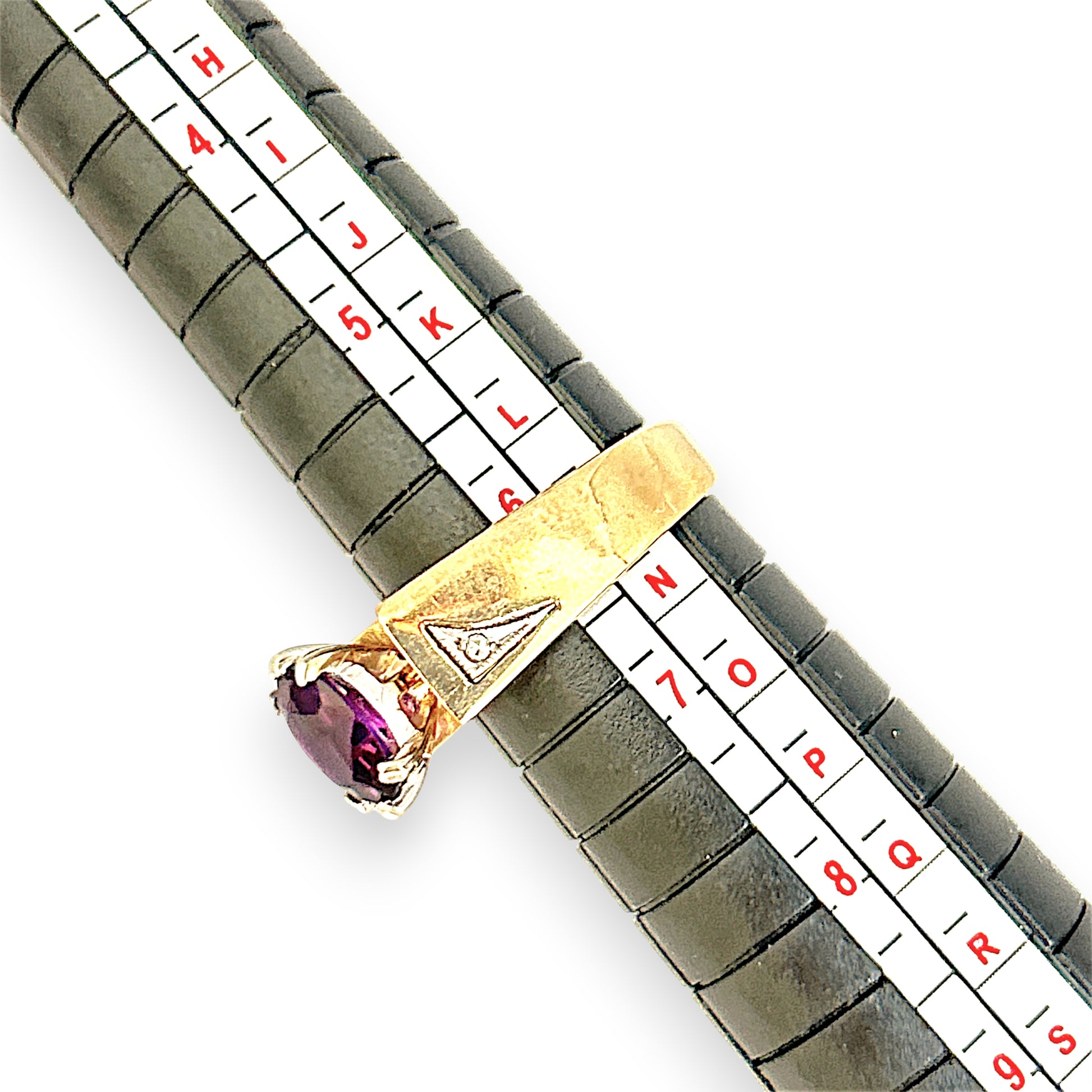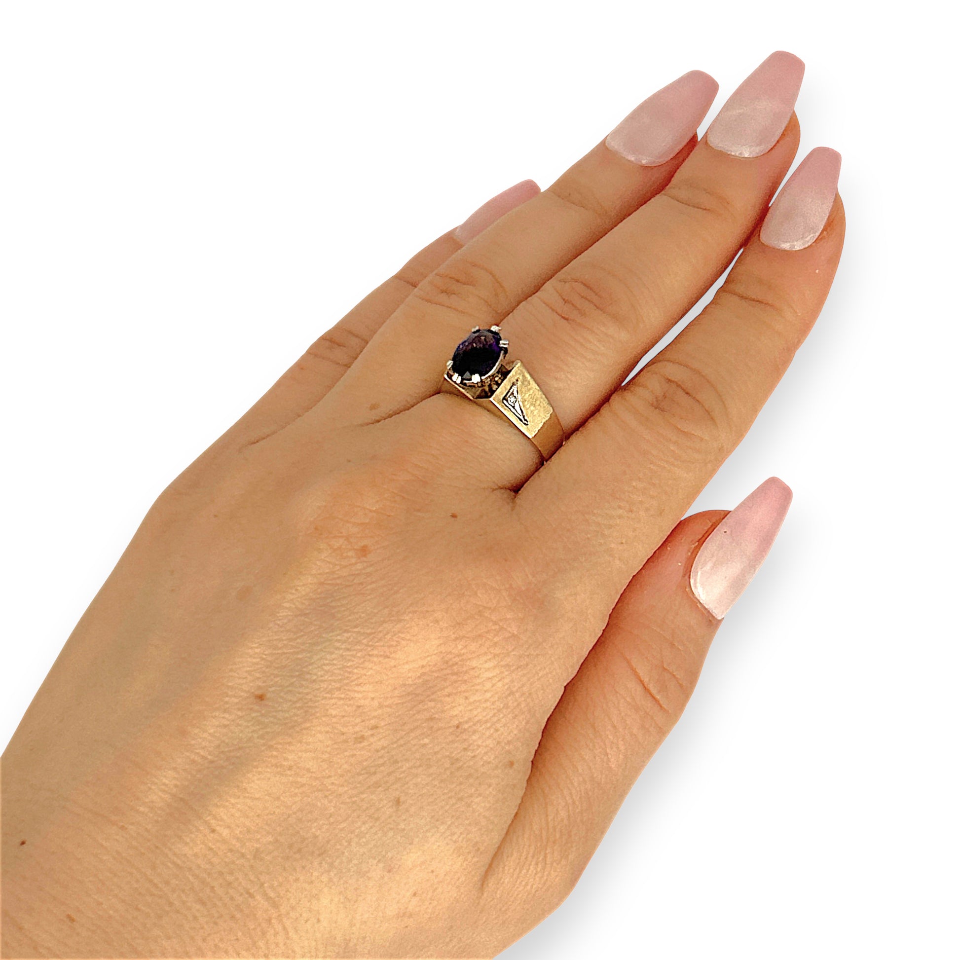 Crafted in radiant 9ct yellow gold, this distinctive ring features a richly hued oval-cut amethyst held securely by six polished prongs. The gemstone’s deep violet tone evokes elegance and inner strength, while the flanking triangular engravings—each set with natural diamonds—add a bold, architectural flair. The wide, polished band enhances the ring’s presence, balancing vintage symbolism with modern sophistication. A perfect piece for those who appreciate meaningful design and timeless color, this ring speaks with quiet confidence and refined artistry.