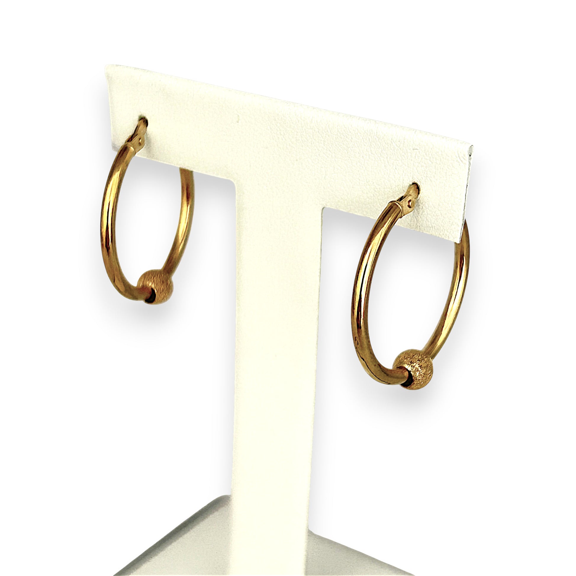 These elegant hoop earrings are crafted in polished gold and feature a classic circular silhouette accented by a small textured sphere suspended at the base of each hoop. The sphere adds a subtle yet distinctive touch, contrasting beautifully with the smooth, reflective surface of the hoops. Designed with hinged clasps for secure and comfortable wear, this pair blends timeless simplicity with a hint of artisan detail—perfect for adding understated charm to everyday style.