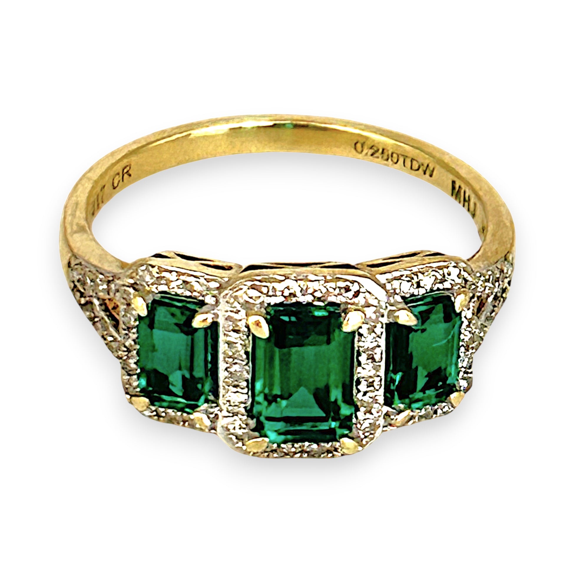 A captivating blend of classic charm and vibrant elegance, the Emerald Radiance ring by Michael Hill features three striking rectangular-cut synthetic emeralds, each framed by a halo of natural diamonds. Crafted in rich 10-carat yellow gold, this piece showcases 0.25 carats of dazzling diamonds that beautifully contrast the vivid green stones. A timeless design that adds a touch of luxury and colour to any collection.