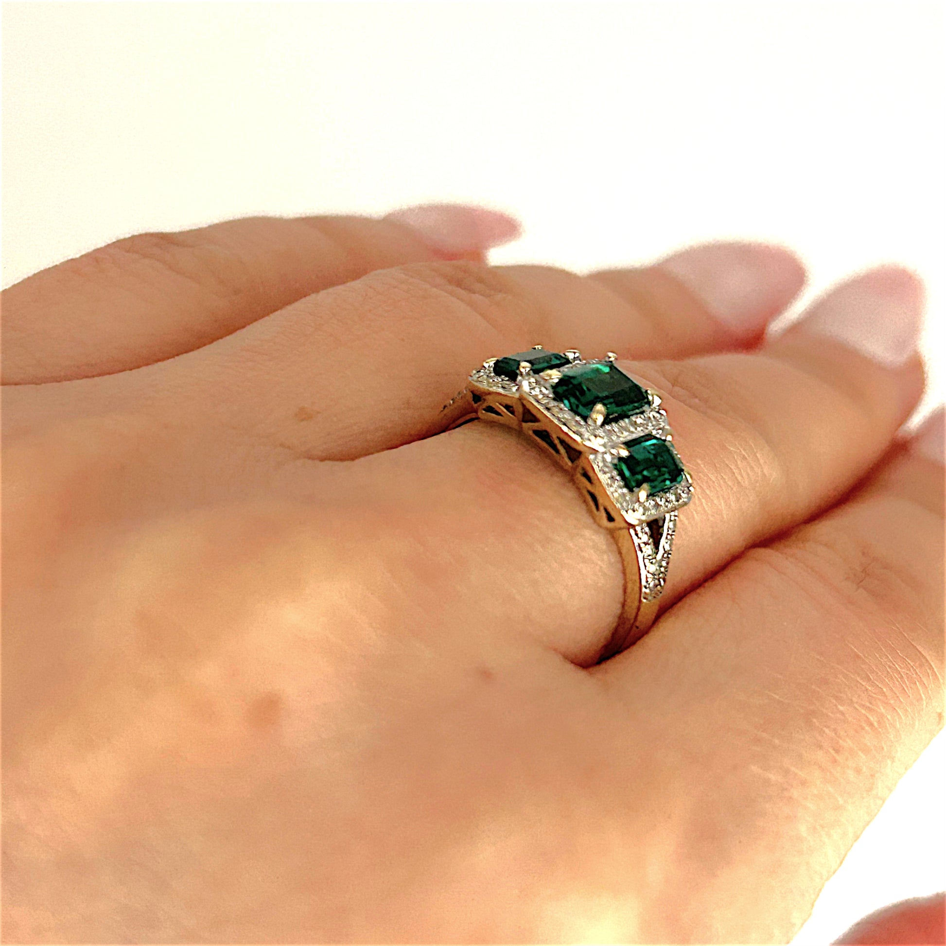 • Stone: 46 Natural single cut diamonds TDW 0.25ct & 3 Synthetic emeralds 0.92ct