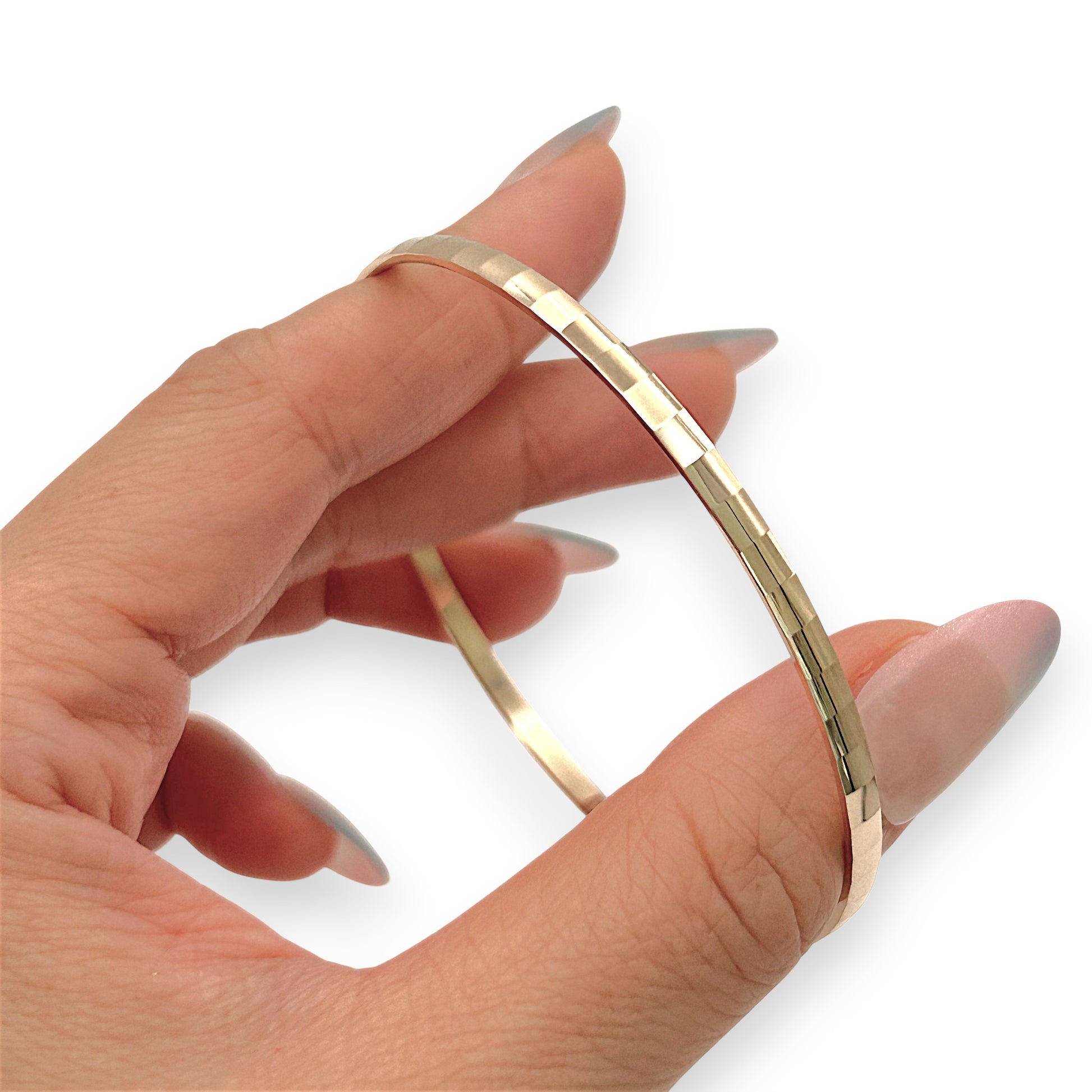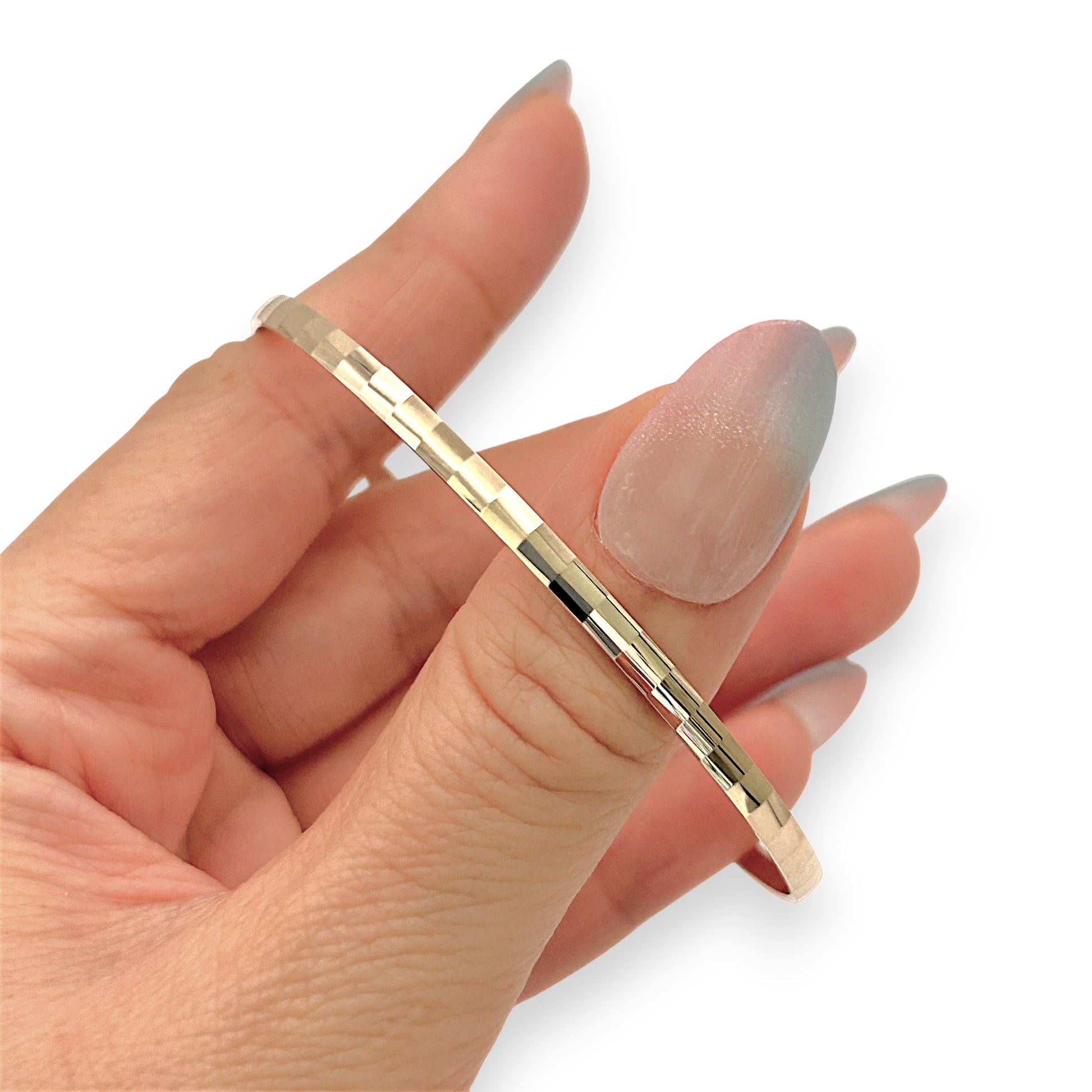 A refined classic with a modern edge, this 9ct gold textured bangle features a subtle geometric pattern that catches the light beautifully. Its slim, polished profile makes it perfect for everyday wear or stacking with your favourite pieces. Crafted in genuine 9ct gold, it offers timeless elegance with a contemporary finish