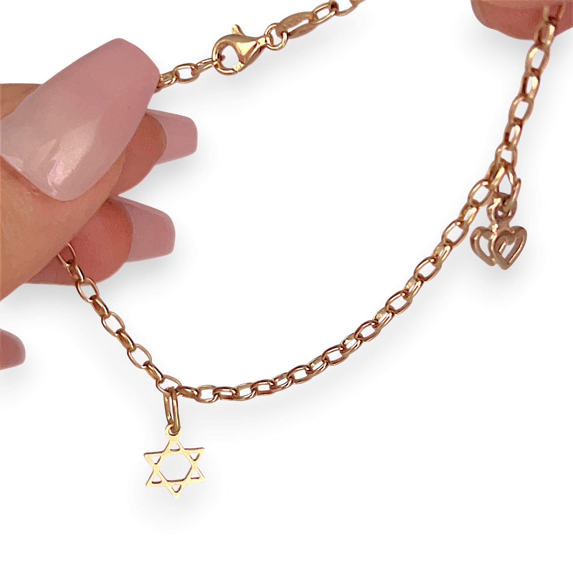 Crafted in radiant 9ct yellow gold, this elegant belcher bracelet features two meaningful charms—a six-pointed star symbolizing protection or spiritual identity, and a delicate heart representing love and connection. The classic belcher link design offers timeless appeal and everyday durability, while the secure lobster clasp ensures comfortable wear. Whether worn as a personal keepsake or gifted with intention, this bracelet blends sentiment and sophistication in one graceful piece.