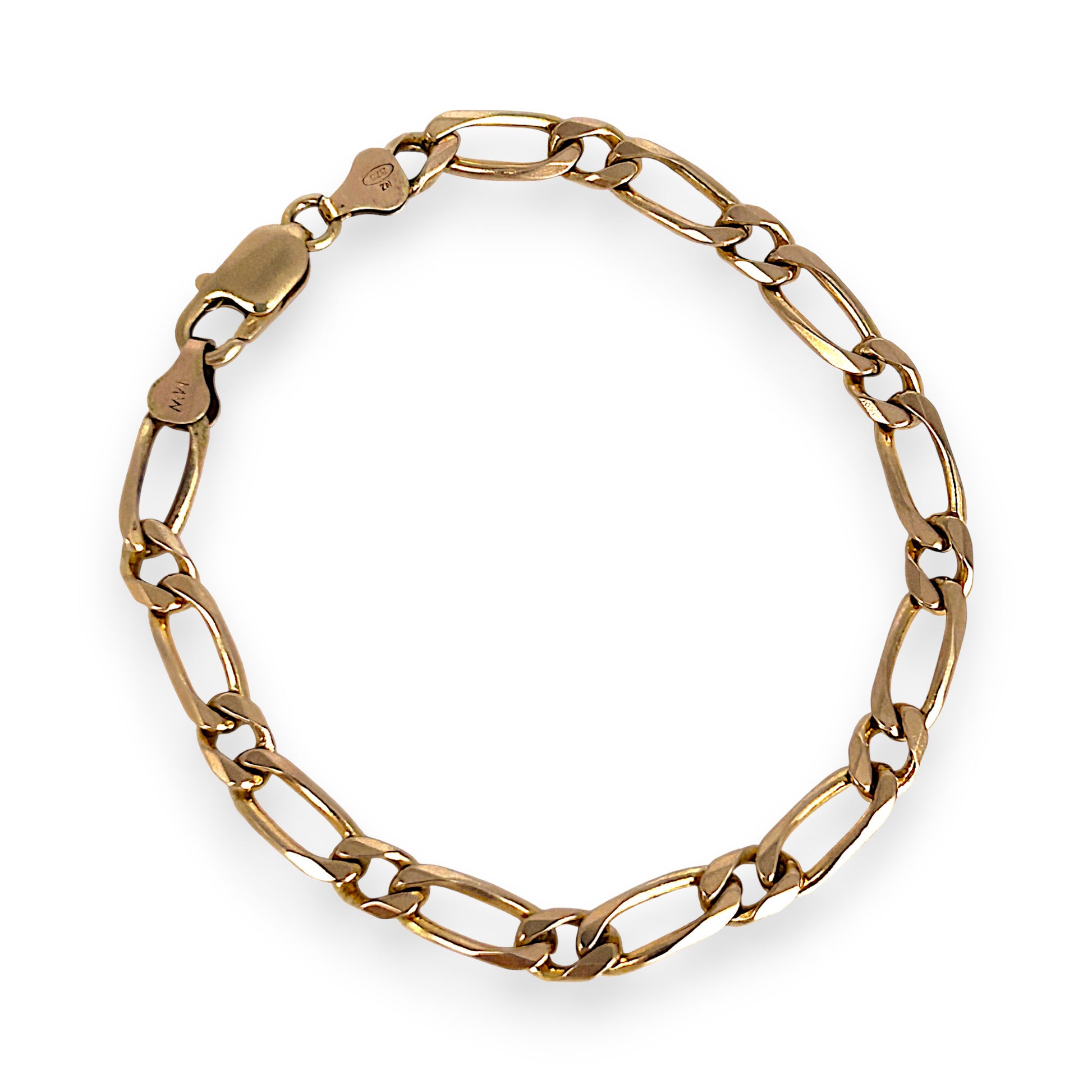 This 9ct gold bracelet showcases the iconic Figaro design with elongated oval links alternating between sets of smaller rounded links, creating a rhythmic and refined silhouette. Each link is polished to a radiant finish, offering a warm golden glow that complements both casual and formal styles. Secured with a sturdy lobster clasp engraved with a “375” hallmark, this bracelet blends durability with classic sophistication—perfect as a standalone statement or layered with other favorites.