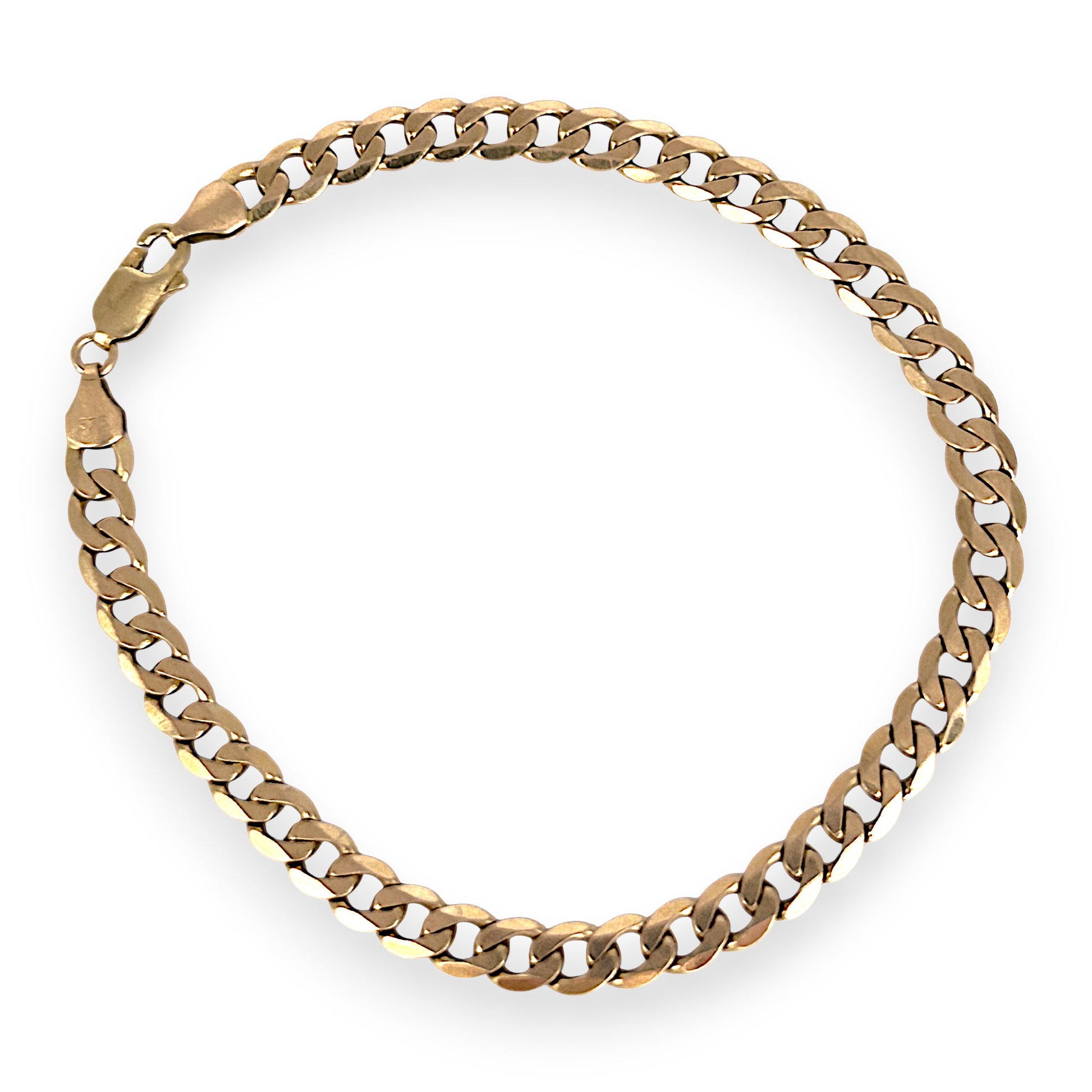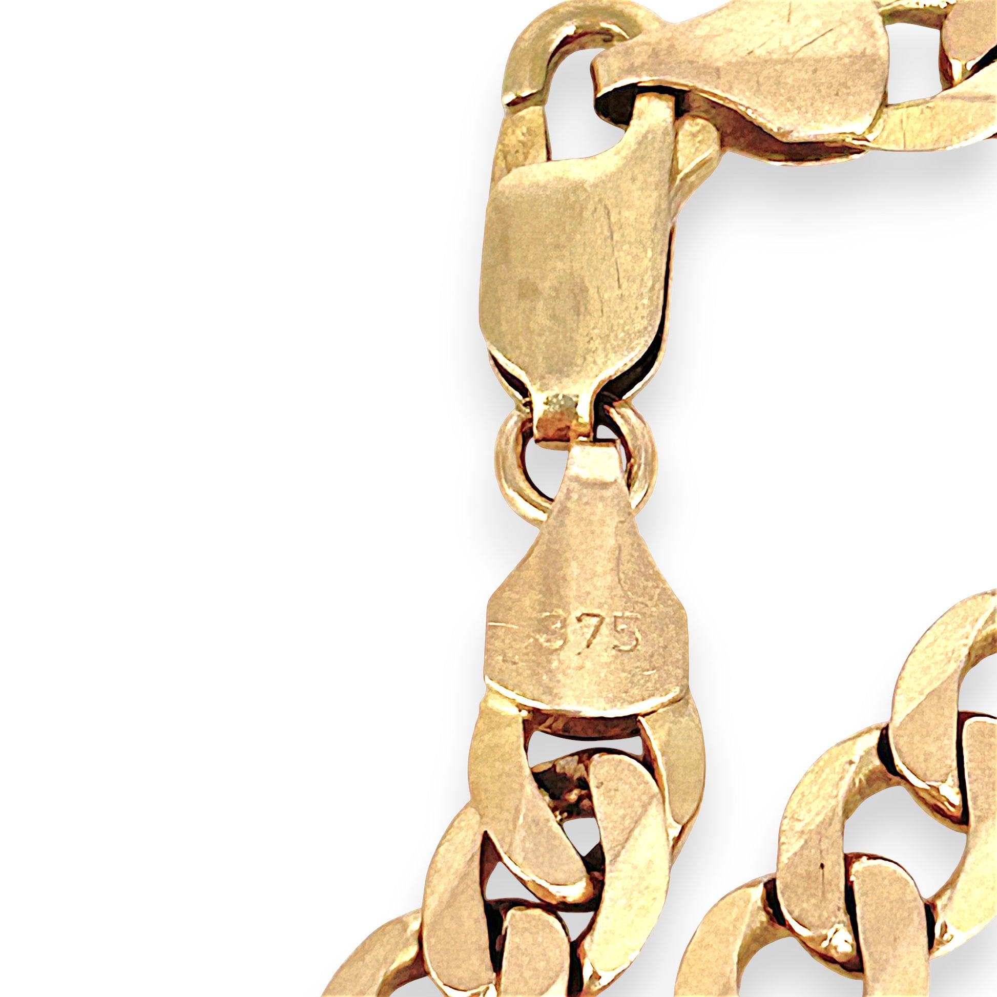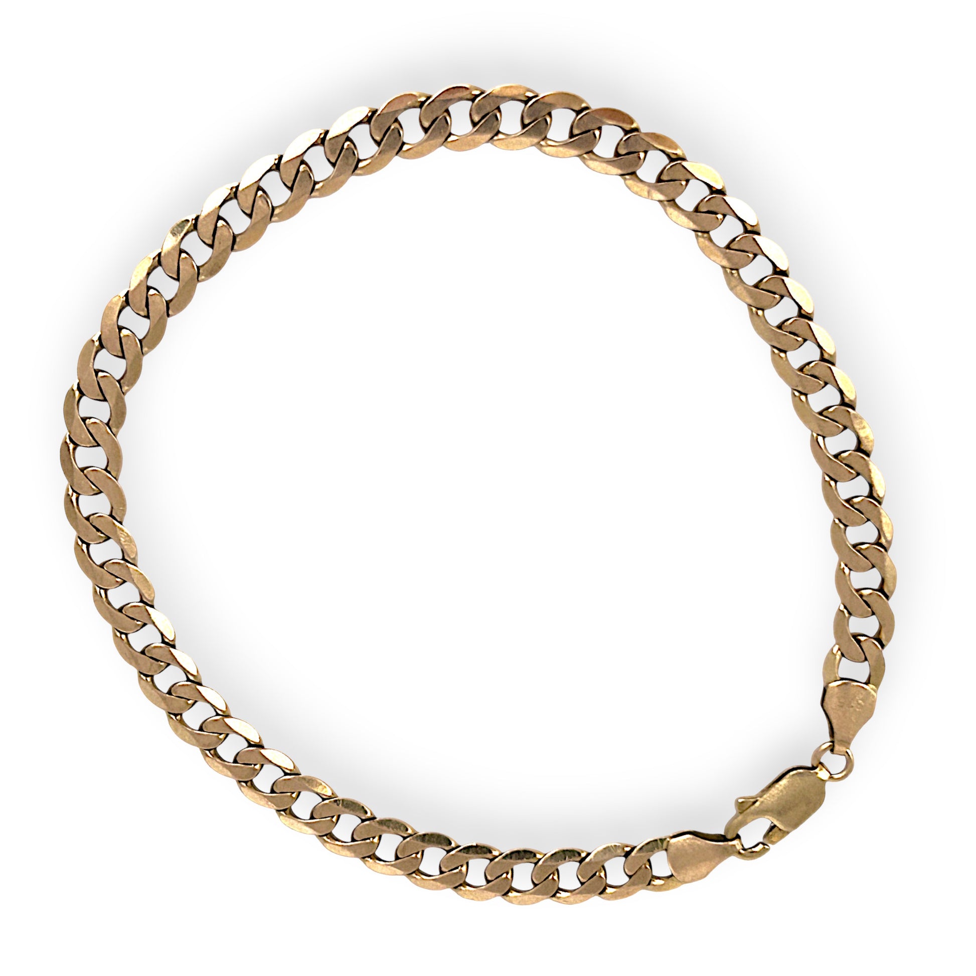 Refined yet bold, this 9ct gold bracelet showcases a series of flawlessly polished flat curb links that lie smoothly against the skin, catching light with every movement. The streamlined silhouette and rich golden hue exude effortless sophistication, while the secure lobster clasp adds a touch of functional finesse. Whether worn solo or layered for impact, this bracelet is a statement of modern elegance—crafted for those who appreciate clean lines, radiant shine, and enduring style.
