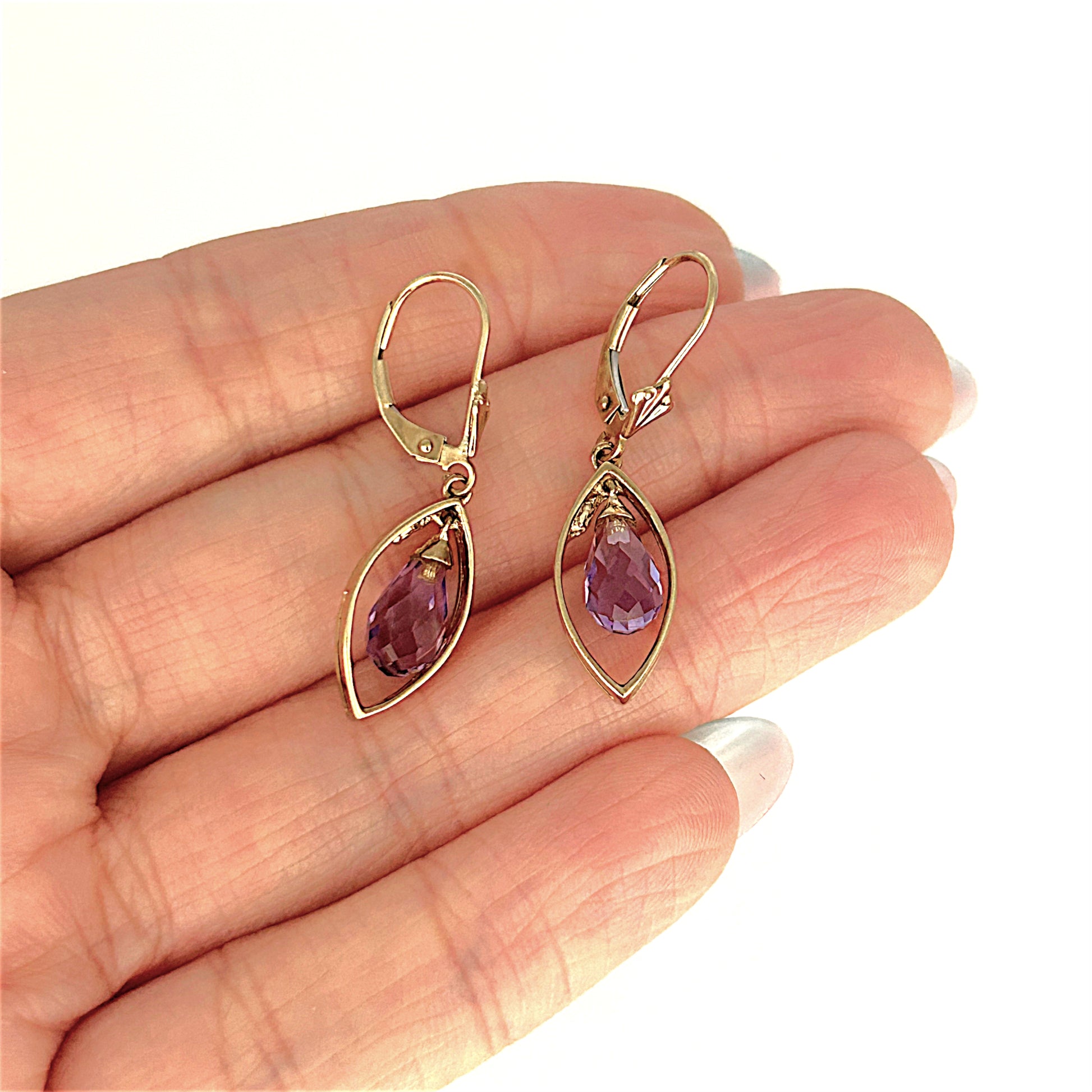 Crafted in 9-carat gold, these stunning earrings feature teardrop-shaped, faceted amethyst gemstones set within elegant marquise-style gold frames. The intricate detailing at the top adds a touch of sophistication, while the lever-back closures ensure secure and comfortable wear. The rich purple hue of the amethyst beautifully complements the warm glow of gold, making these earrings a timeless addition to any jewellery collection — perfect for both everyday elegance and special occasions.