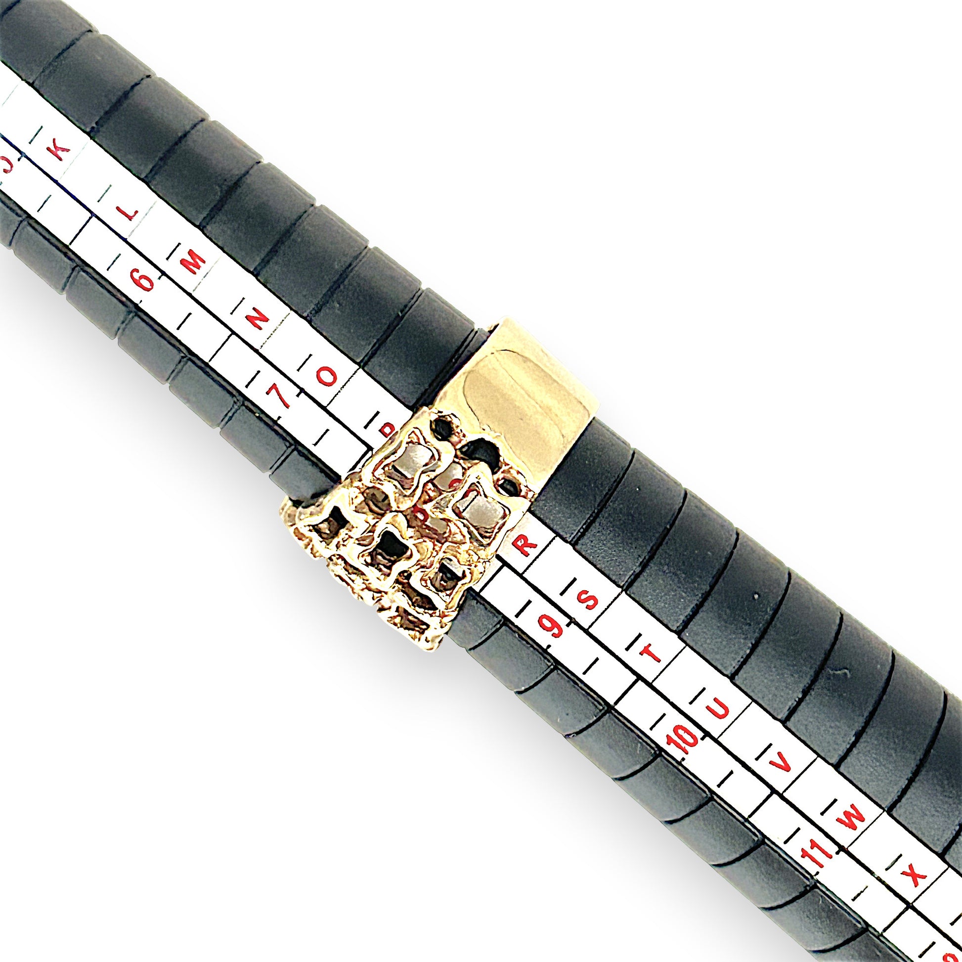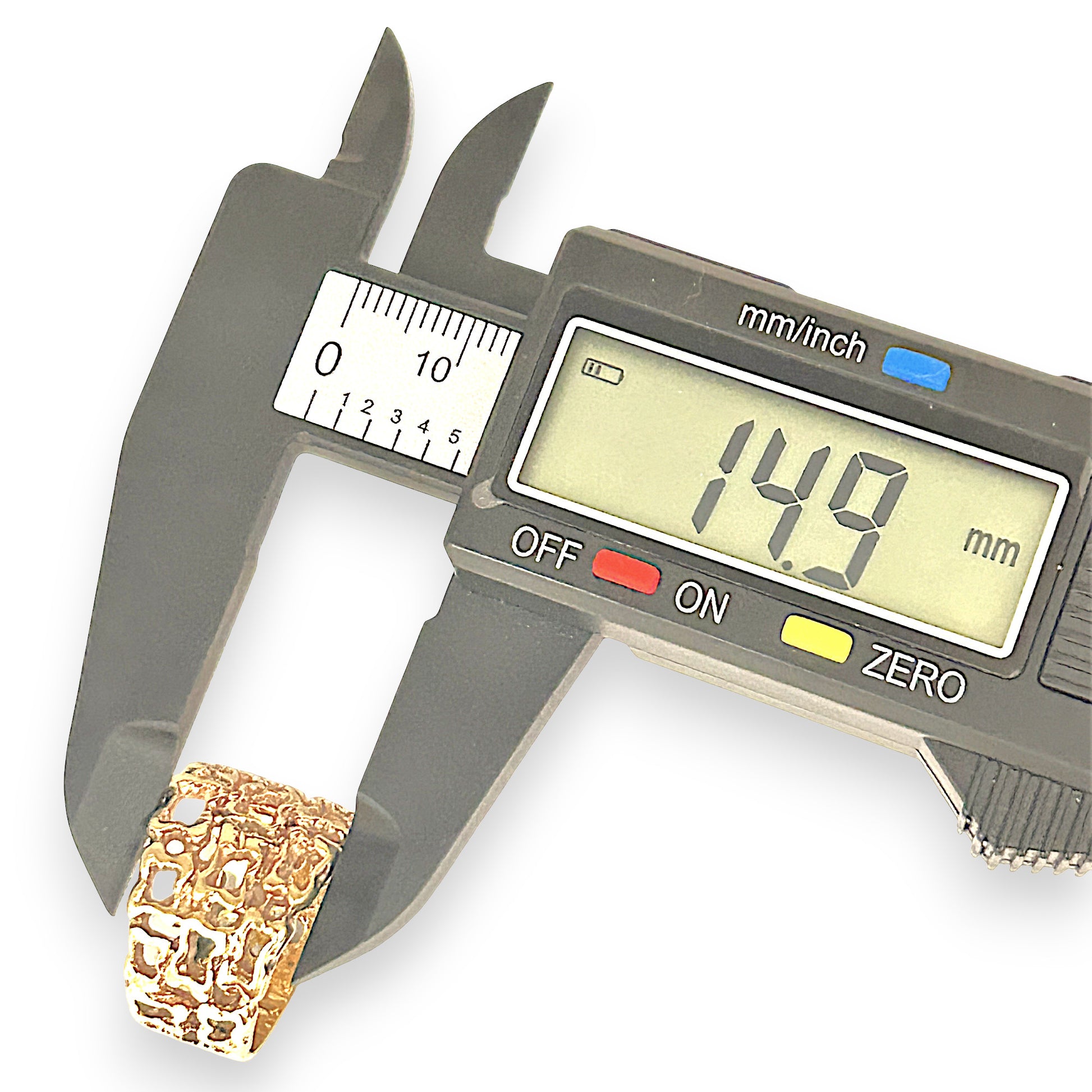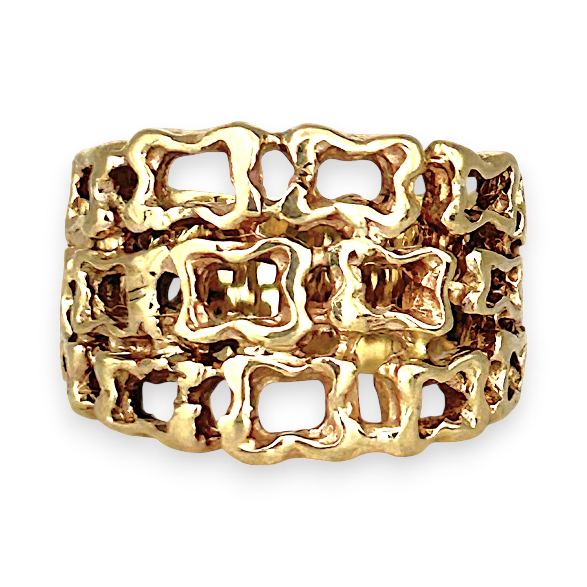 A true statement of artistry, this 9ct gold ring features a sculpted openwork design of interlocking geometric forms, creating a lace-like mosaic of light and shadow. Its polished finish enhances the intricate craftsmanship, making each angle a visual delight. Distinctive and bold, this piece stands apart as a celebration of modern elegance and timeless design.
