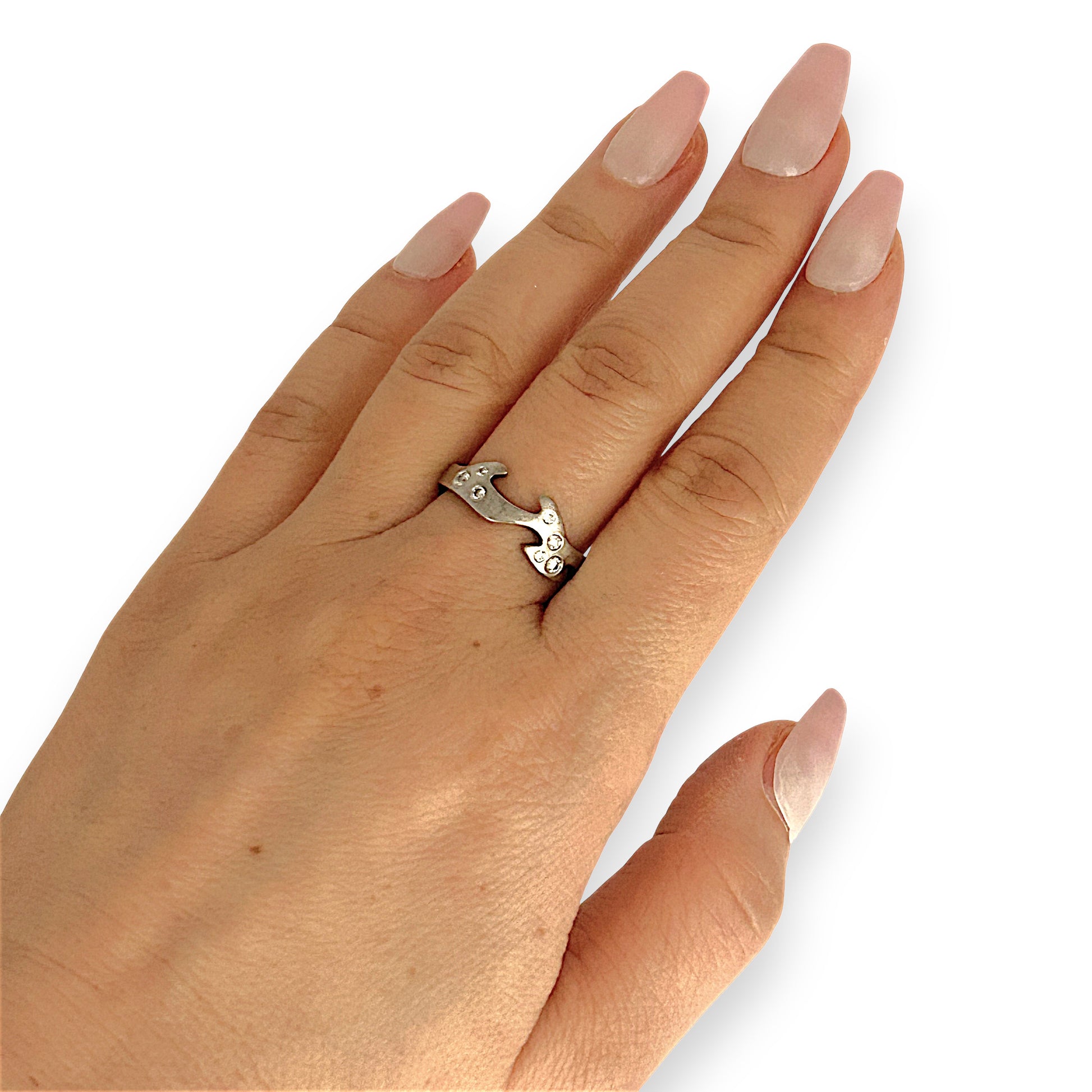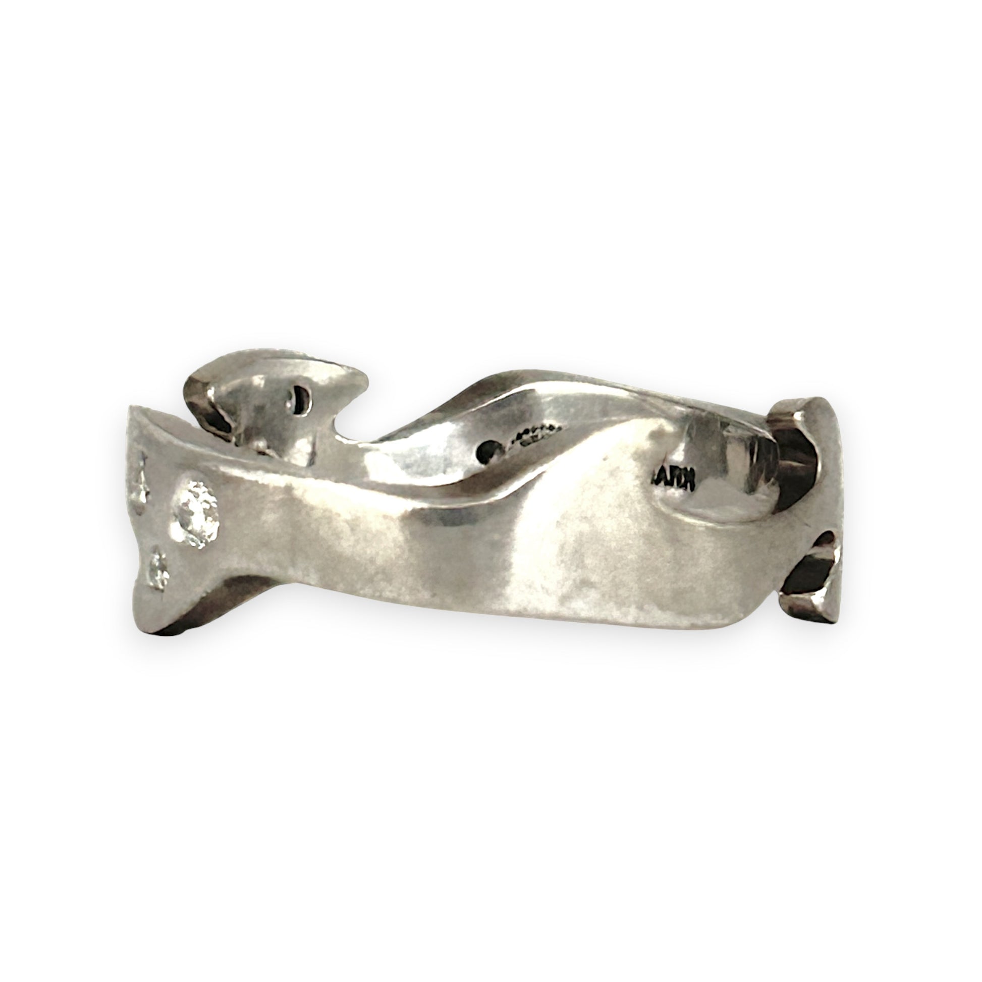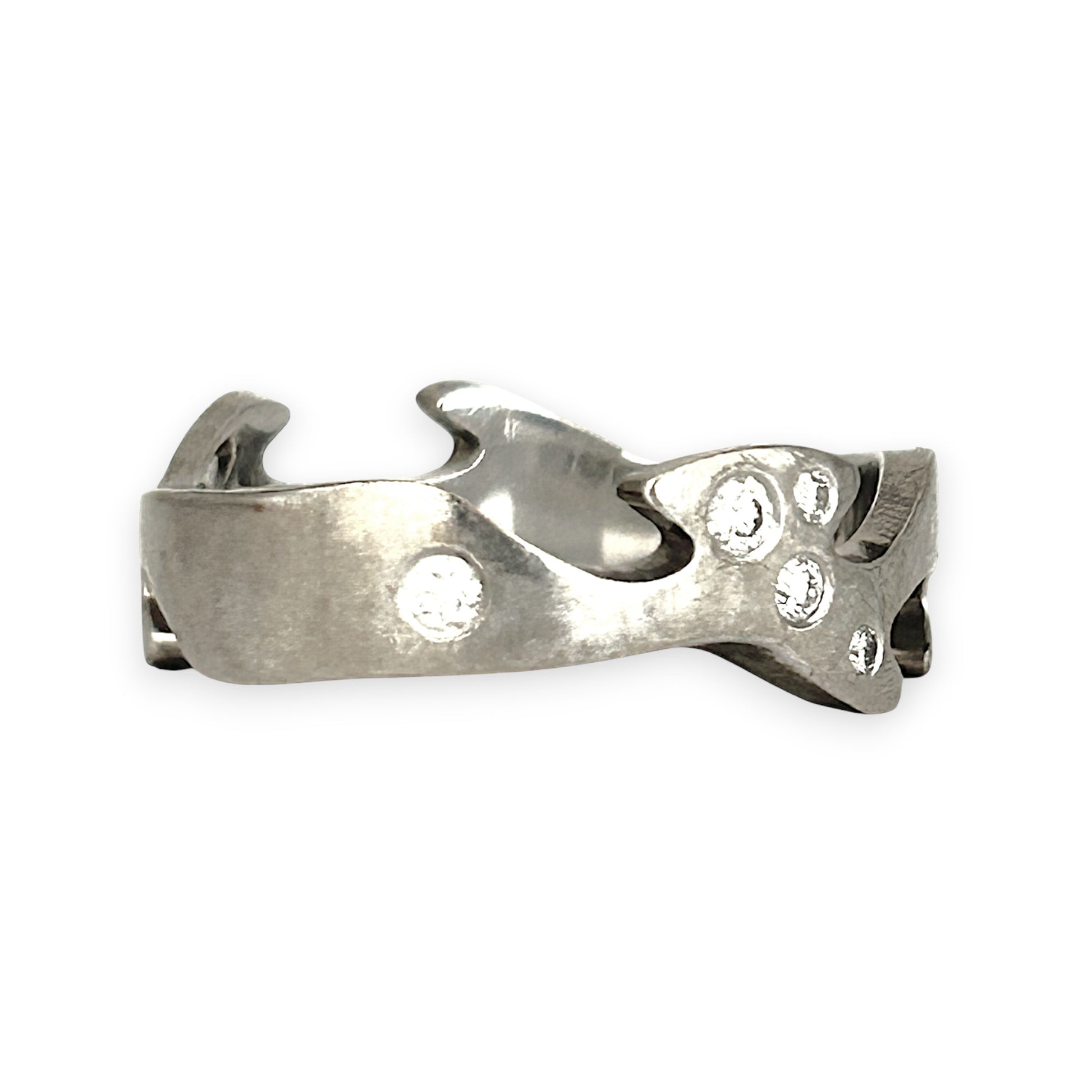 A striking blend of artistry and elegance, this 18ct white gold ring features a sculpted, irregular silhouette with delicate cutouts and a textured finish.