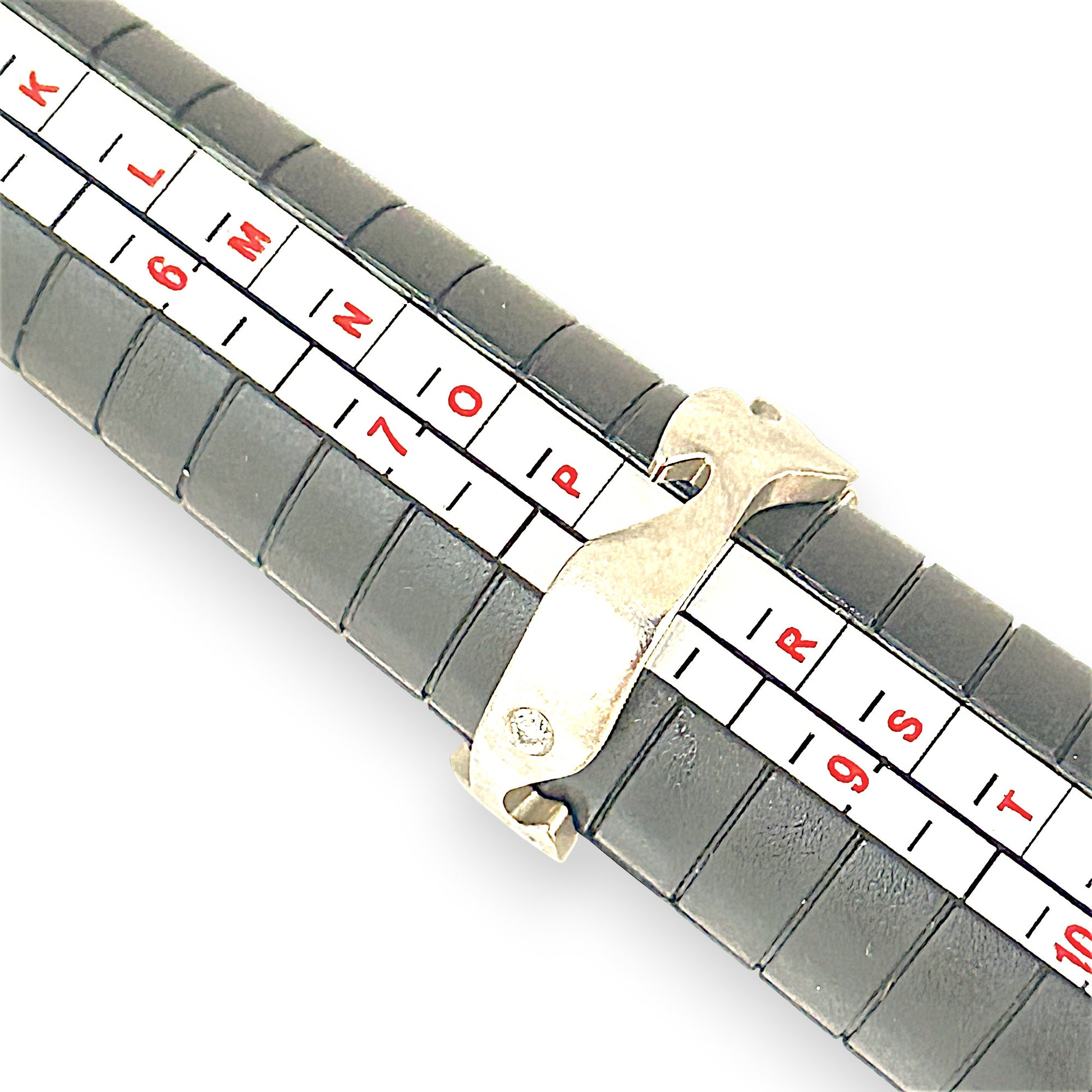 Three round diamonds are nestled into the band, adding subtle sparkle to its bold, contemporary form. A truly distinctive piece that celebrates individuality and refined design.