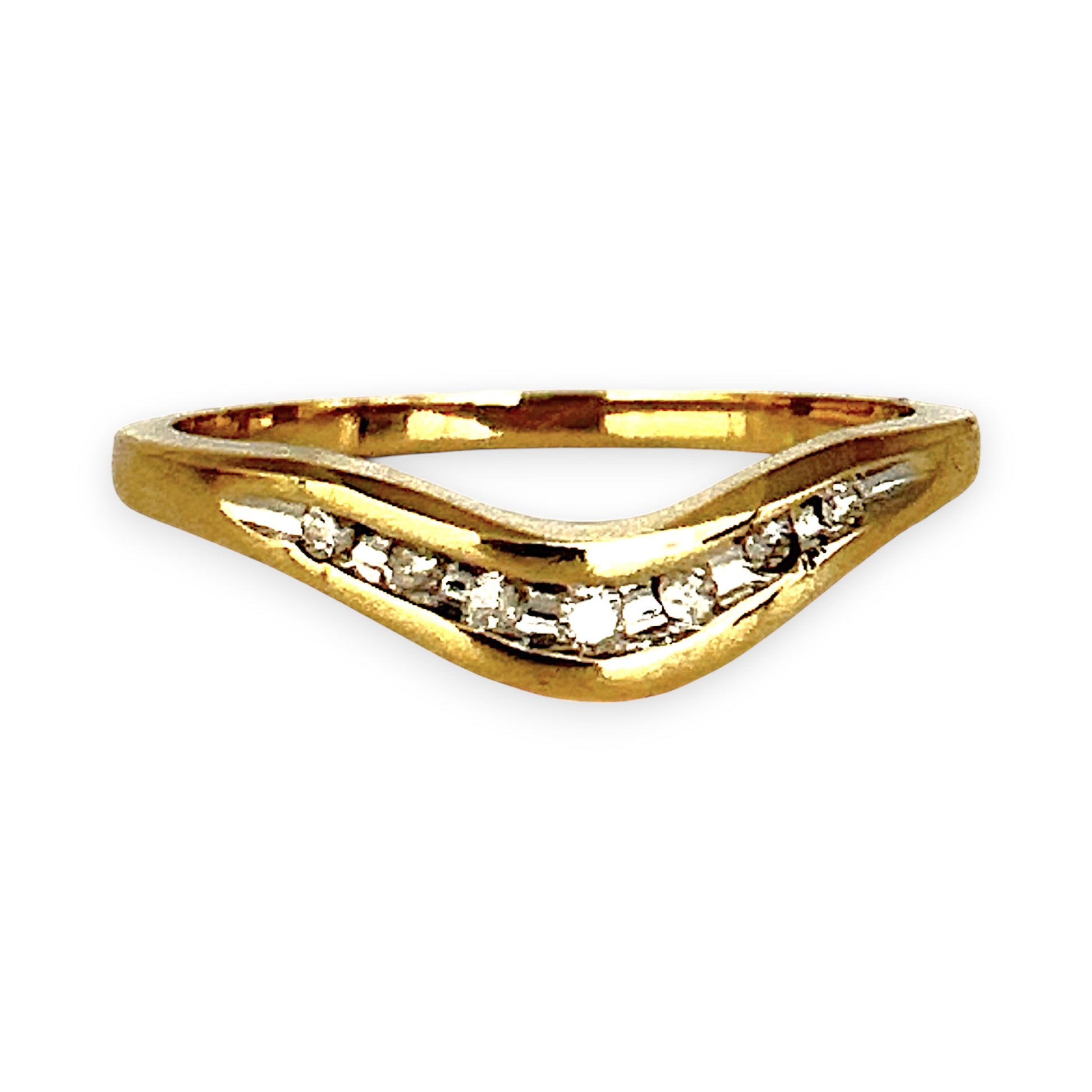 A beautifully crafted 9-carat gold ring featuring a graceful curved design. The polished gold band is accented with a row of sparkling round-cut diamonds set along the curve, creating a refined and radiant look. This elegant piece is perfect as a one-of-a-kind gift or a timeless addition to any jewellery collection.