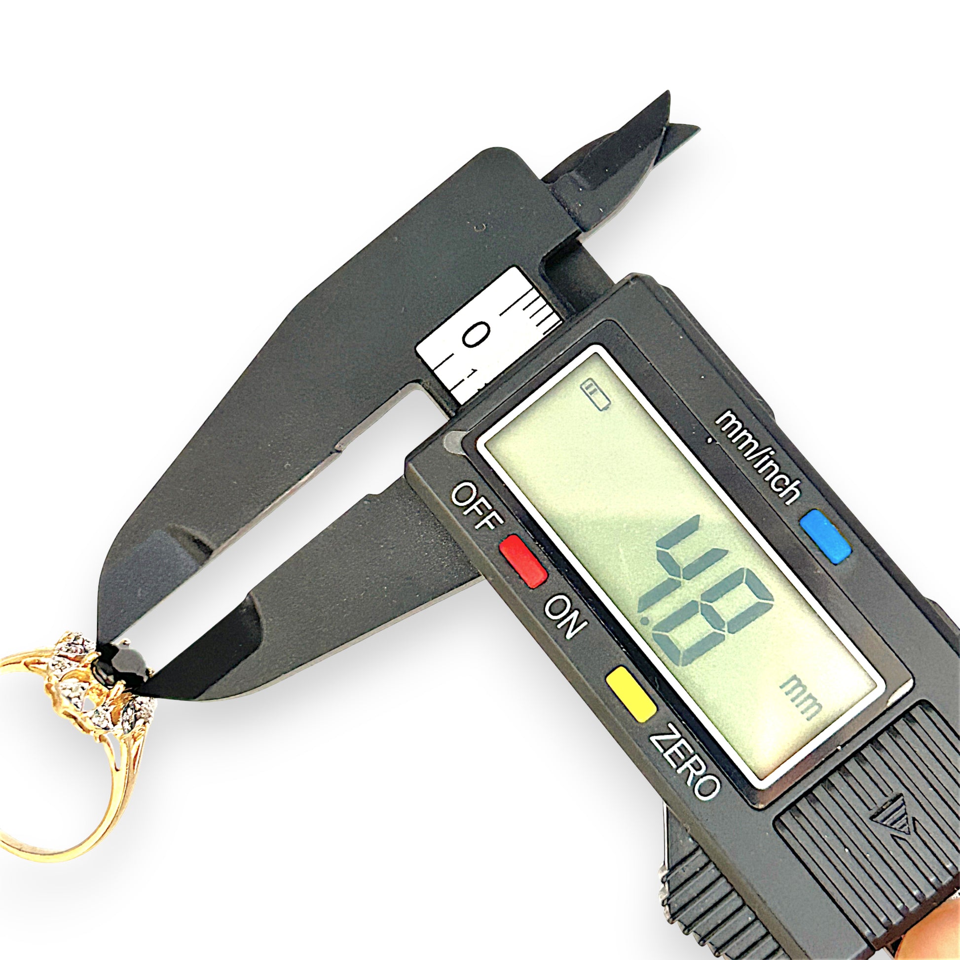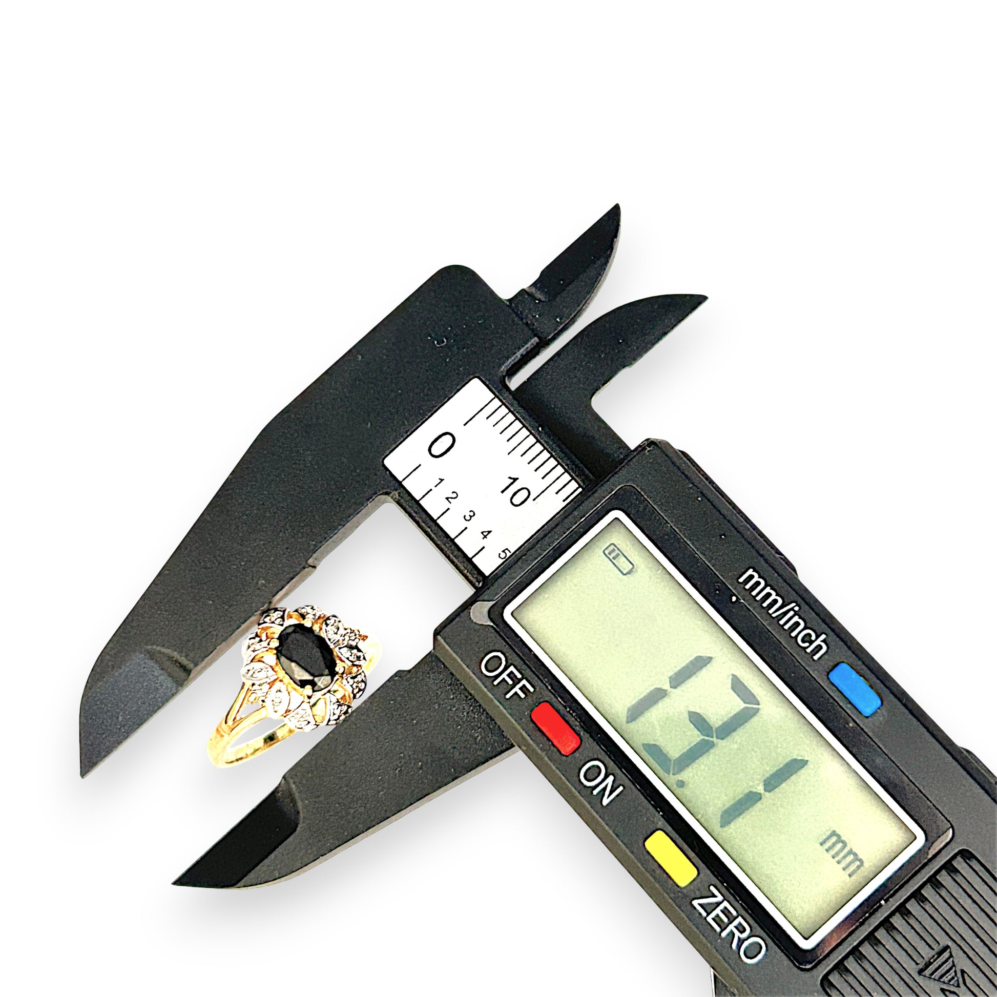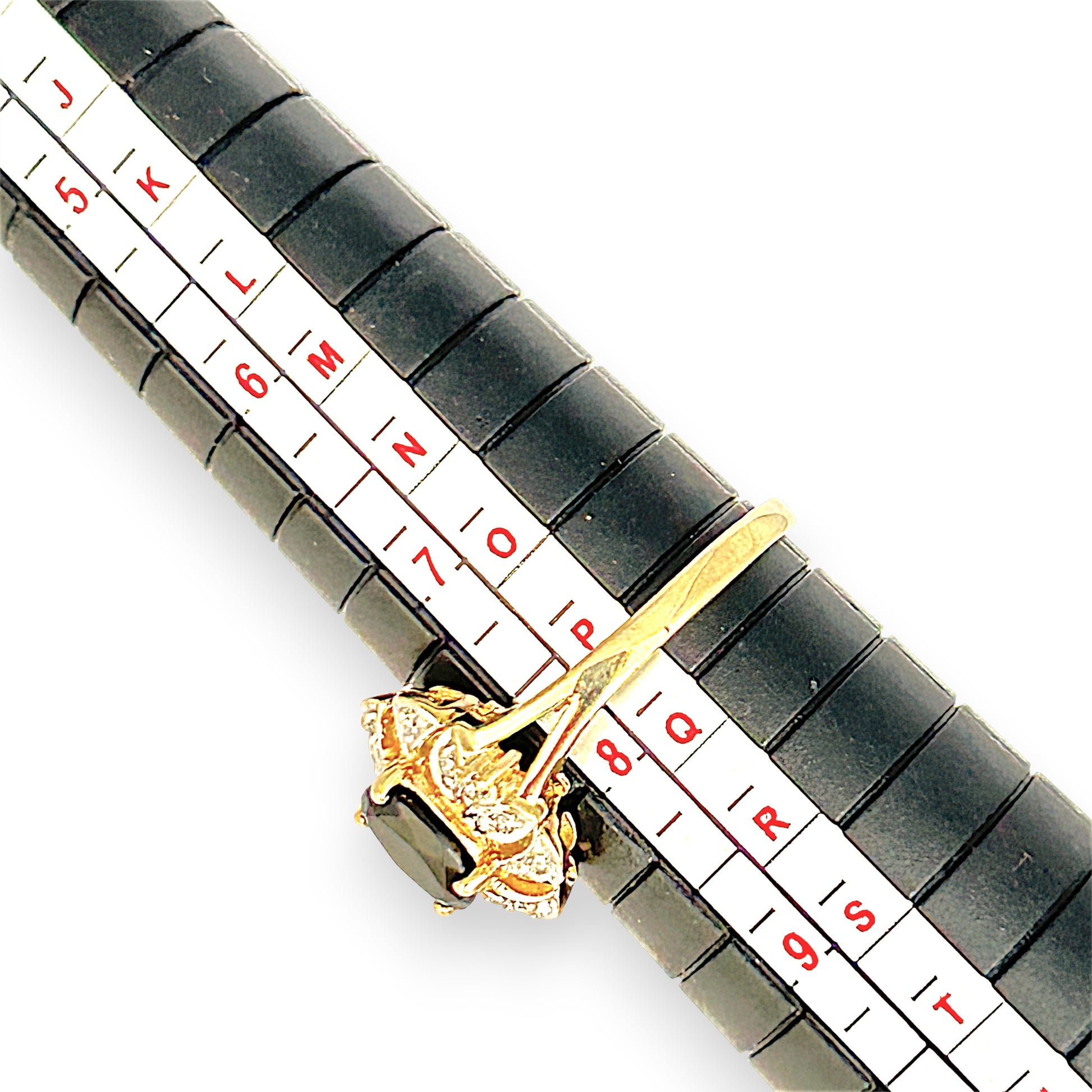 This ornate 9ct gold ring centers around a bold black onyx, framed by a delicate floral motif adorned with shimmering white accent stones. The petal-like arrangement and tapered gold band evoke vintage charm, while the dramatic contrast between the dark gemstone and bright embellishments adds depth and sophistication. A timeless piece that blends romantic design with striking presence—perfect for those who appreciate artistry in every detail..