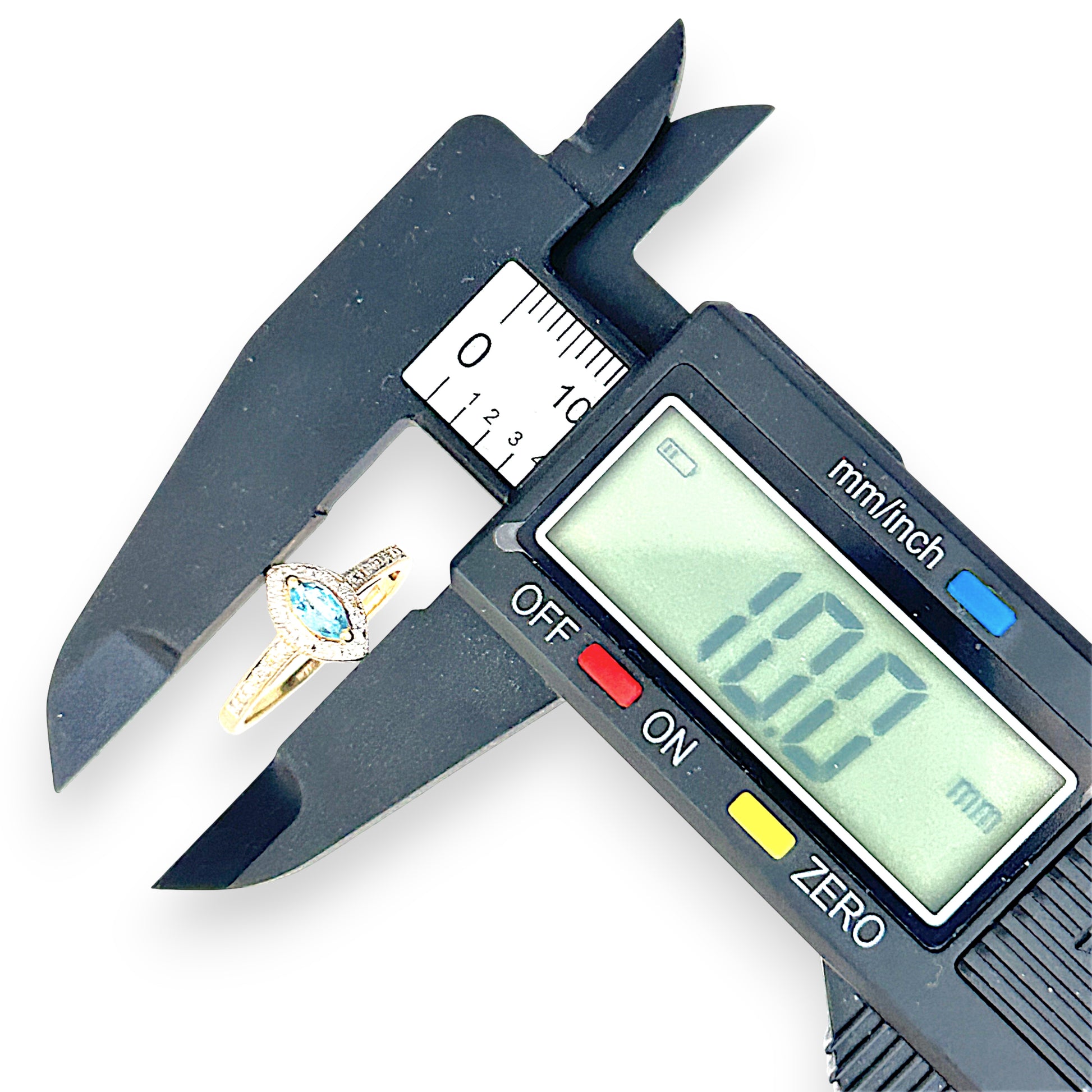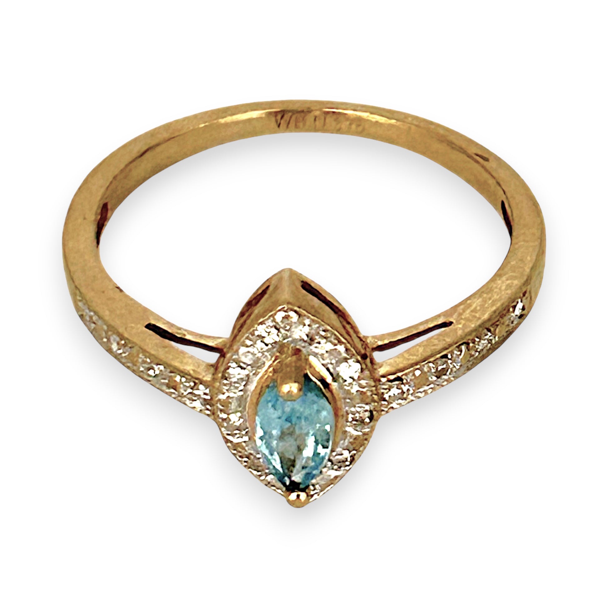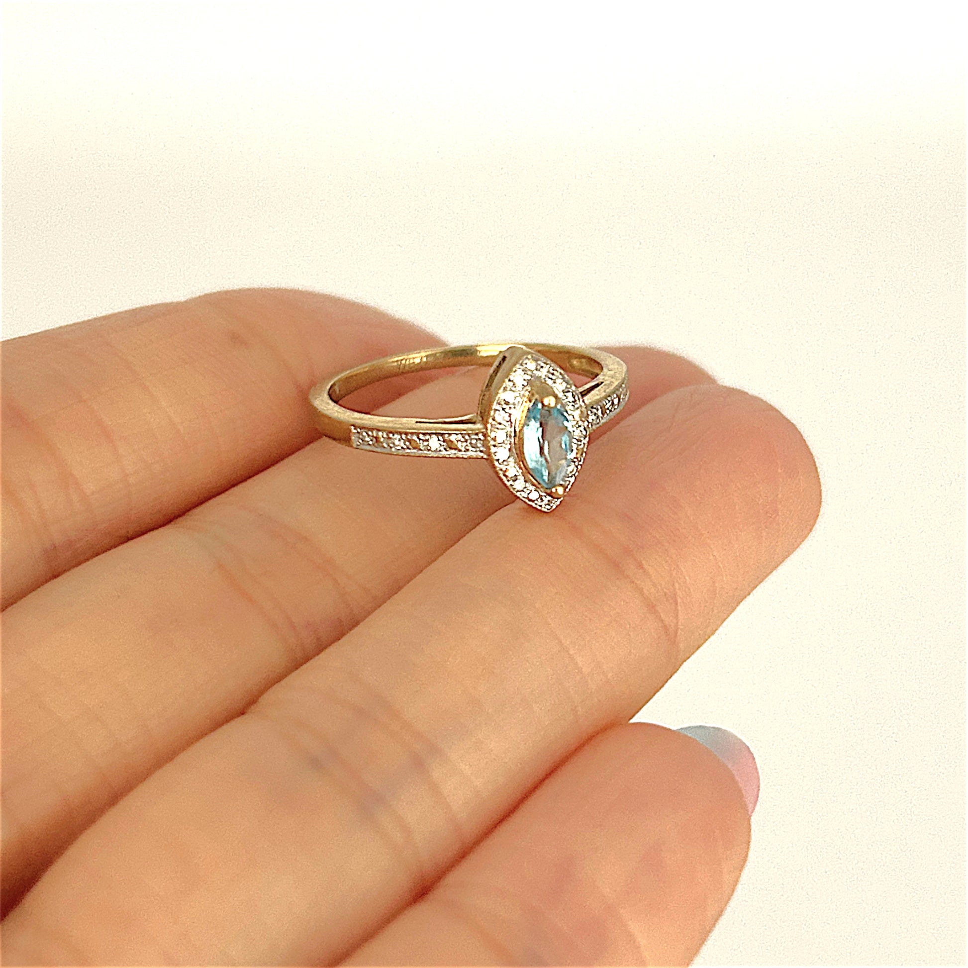 A vision of serenity and sparkle, this 9ct gold ring captures the ethereal beauty of aquamarine in a marquise cut—like a drop of sky cradled in light. Encircled by a halo of brilliant diamonds and flanked by a diamond-studded band, the design evokes timeless elegance with a modern shimmer. The elongated silhouette flatters the finger, while the soft blue hue whispers of calm seas and clear horizons. A piece for dreamers, romantics, and those who carry grace in every gesture..