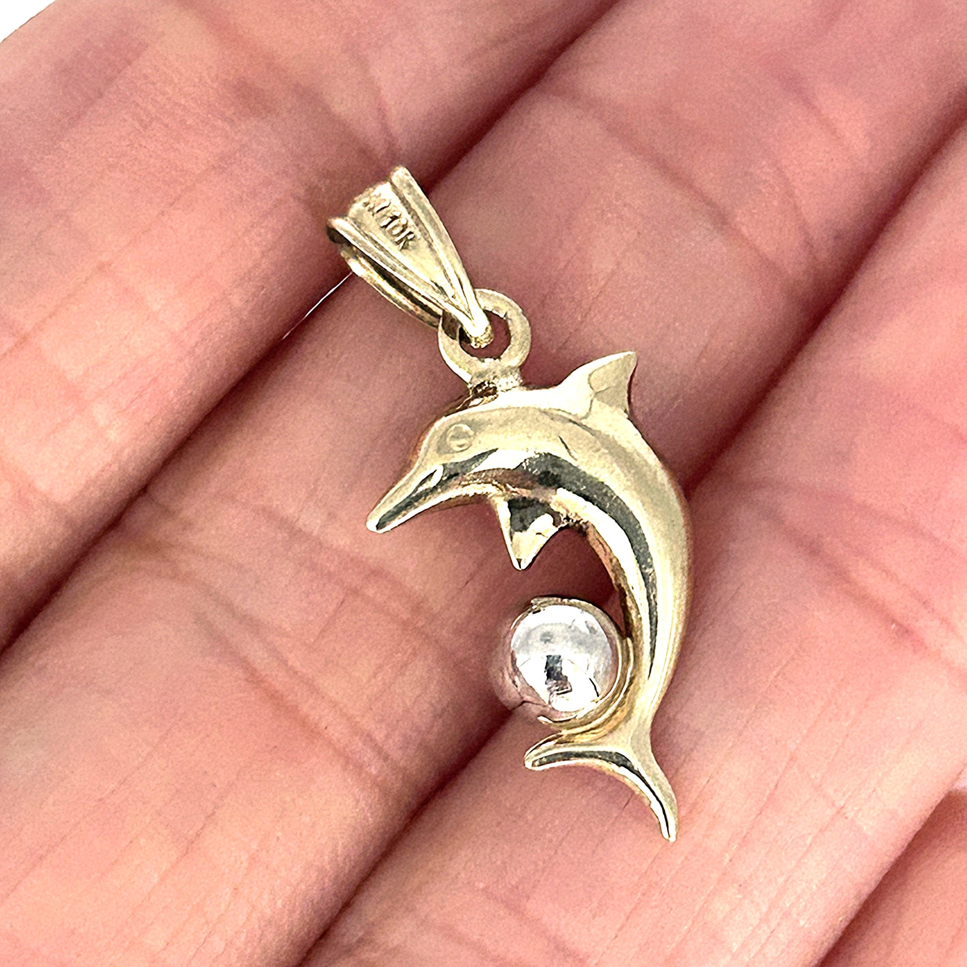 Crafted in luminous 10K yellow and white gold by Michael Hill, this charming dolphin pendant captures the graceful leap of the ocean’s most beloved creature. Curved in mid-motion, the dolphin wraps around a polished white gold ball, adding contrast and intrigue to the design. Its sleek body and detailed fins are brought to life with a high-shine finish, while the engraved 10K bail ensures secure wear. A whimsical symbol of freedom, joy, and fluid elegance—perfect for everyday inspiration or a meaningful gift..