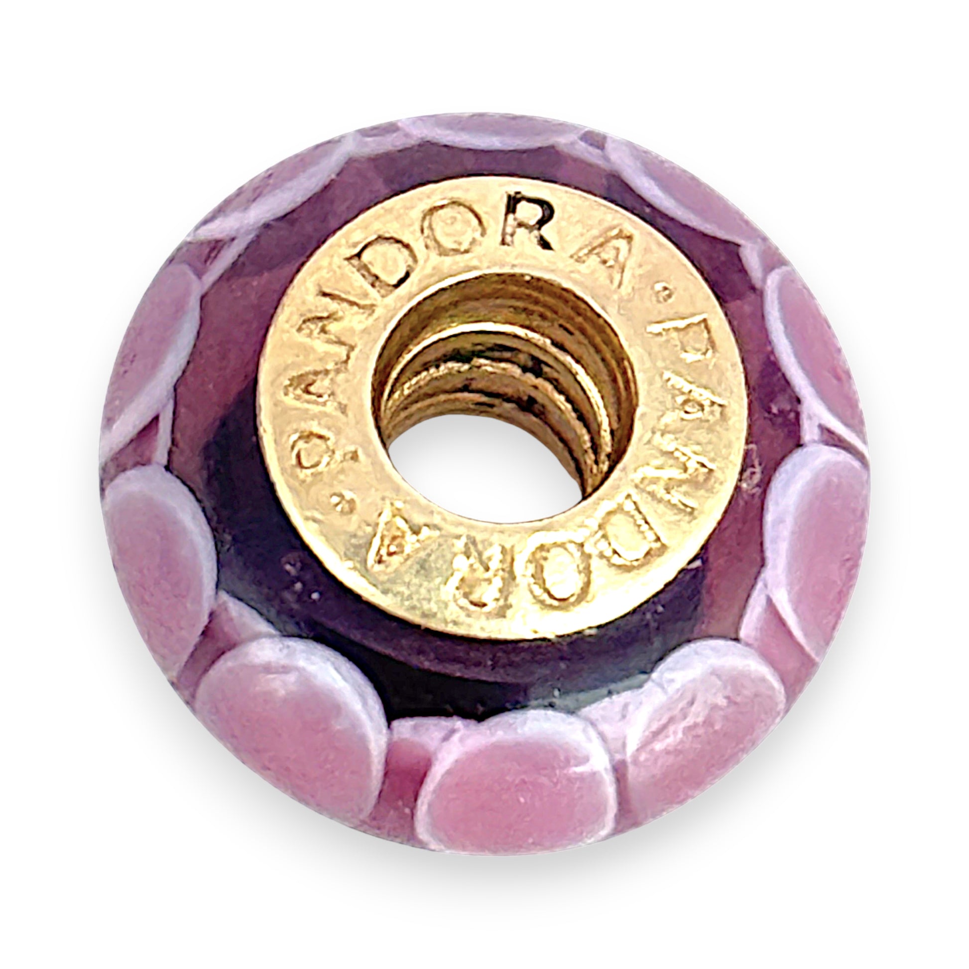 Celebrate personal style with this exquisite Pandora charm, crafted from rich Murano glass and adorned with soft pink lotus petal motifs. The floral design blooms against a deep background, creating a delicate yet vibrant contrast. At its center, a polished gold-toned core engraved with the iconic “PANDORA” branding adds a touch of luxury and authenticity. Designed to be threaded onto bracelets or necklaces, this charm is perfect for expressing individuality, sentiment, or seasonal flair.