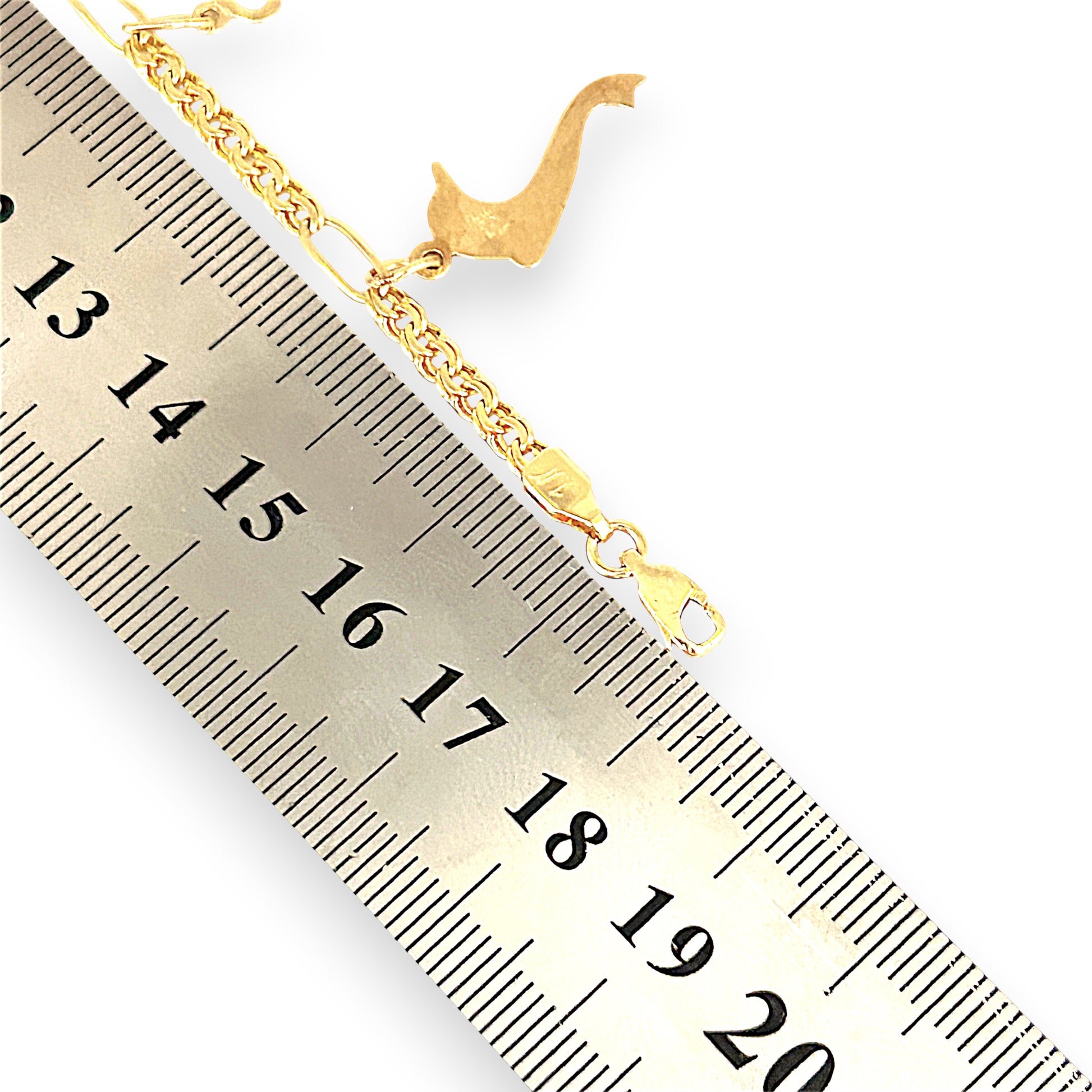 Crafted in radiant 14ct gold, this charm bracelet blends playful elegance with symbolic depth. The polished chain links support five distinct charms: a graceful dolphin, a classic key, a sturdy boot, cute puppy and a soaring pharaoh —each representing freedom, discovery, resilience, and flow. Whether worn as a personal talisman or a statement piece, this bracelet offers timeless charm and golden warmth. A beautiful gift or collectible for those who treasure meaning in every detail..