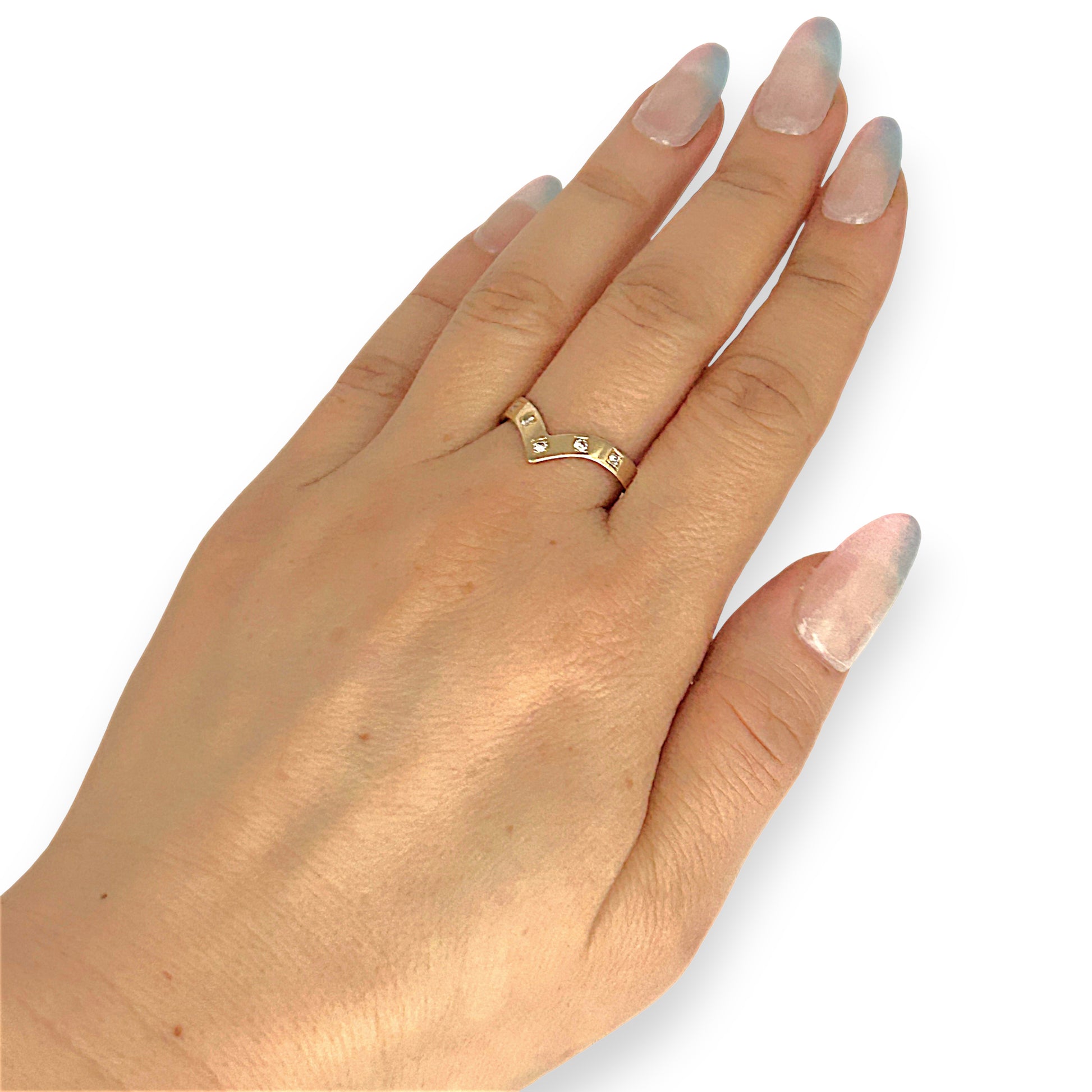 Crafted in luminous 18ct gold, this graceful ring features a V-shaped silhouette adorned with five divine diamonds, each set in a square bezel for structured brilliance. The diamonds diverge along the arms of the “V,” creating a sense of movement, symmetry, and upward elegance. The polished gold band enhances the sparkle, offering a sleek contrast that amplifies the ring’s radiant charm.