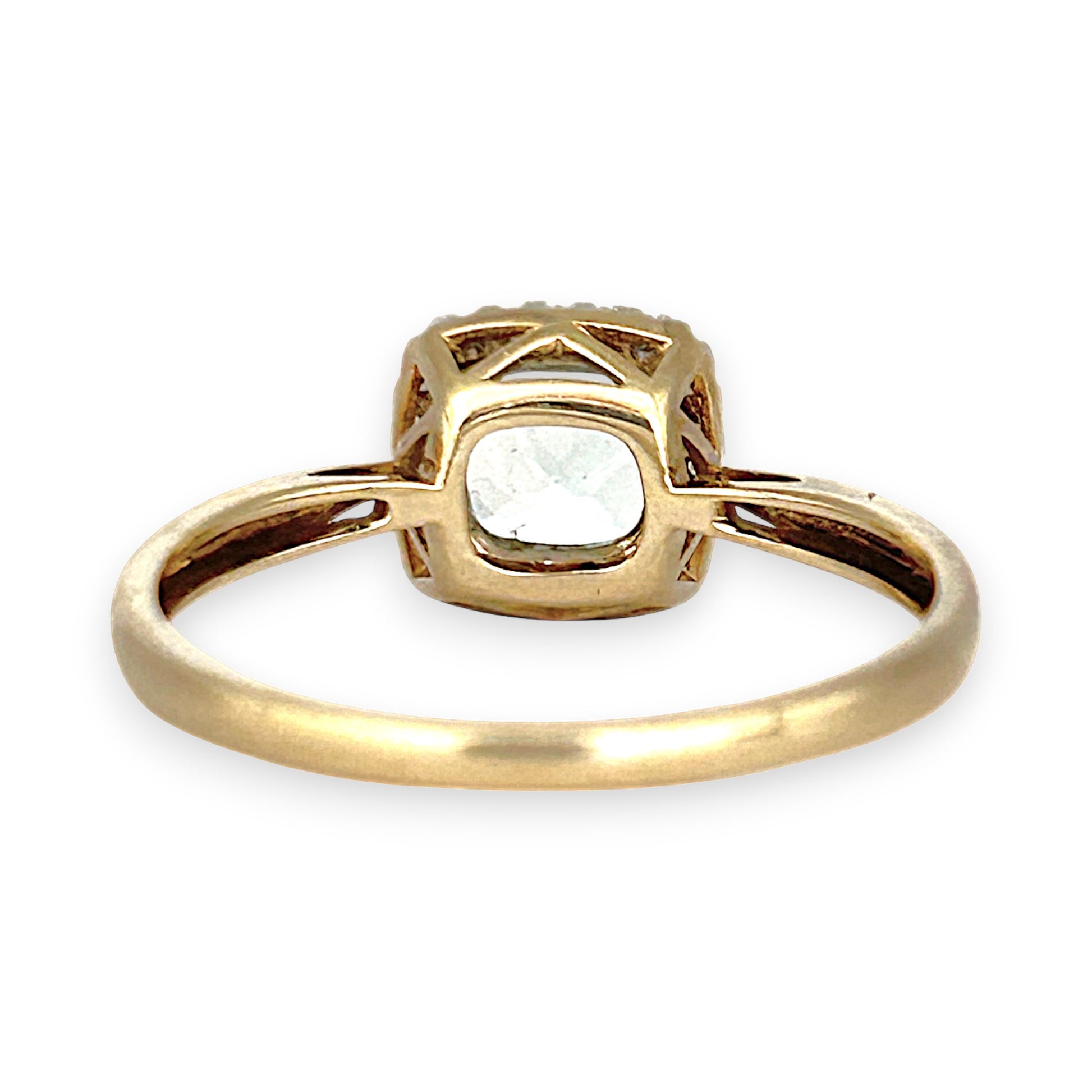 Radiating serene luxury, this 9ct yellow gold ring features a cushion-cut aquamarine at its heart, framed by a halo of brilliant diamonds that enhance its ethereal glow. The soft blue gemstone evokes calm sophistication, while the surrounding stones add a refined sparkle. Set on a polished gold band, the design blends classic charm with contemporary grace. A piece that speaks of quiet opulence and timeless beauty—perfect for marking meaningful moments or elevating everyday style.