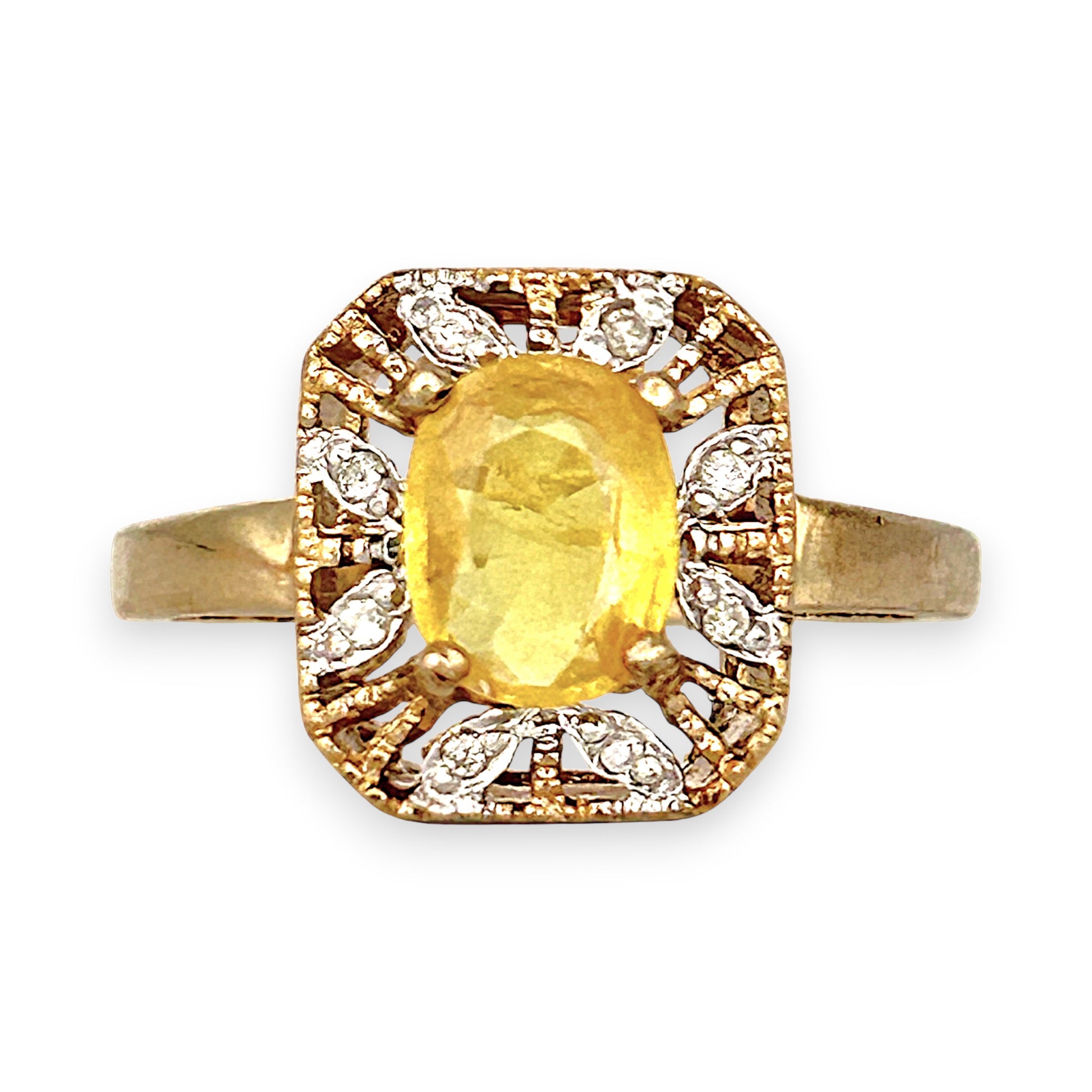 A radiant centerpiece of golden elegance, this 9ct yellow gold ring features a vibrant yellow sapphire framed by a halo of brilliant diamonds in a refined cluster setting. The rectangular design enhances the gemstone’s glow, while the surrounding stones add a burst of sparkle and symmetry. Crafted with precision and warmth, the polished gold band completes the look with timeless grace. A luxurious statement of joy and sophistication—perfect for celebratory moments or everyday grandeur..