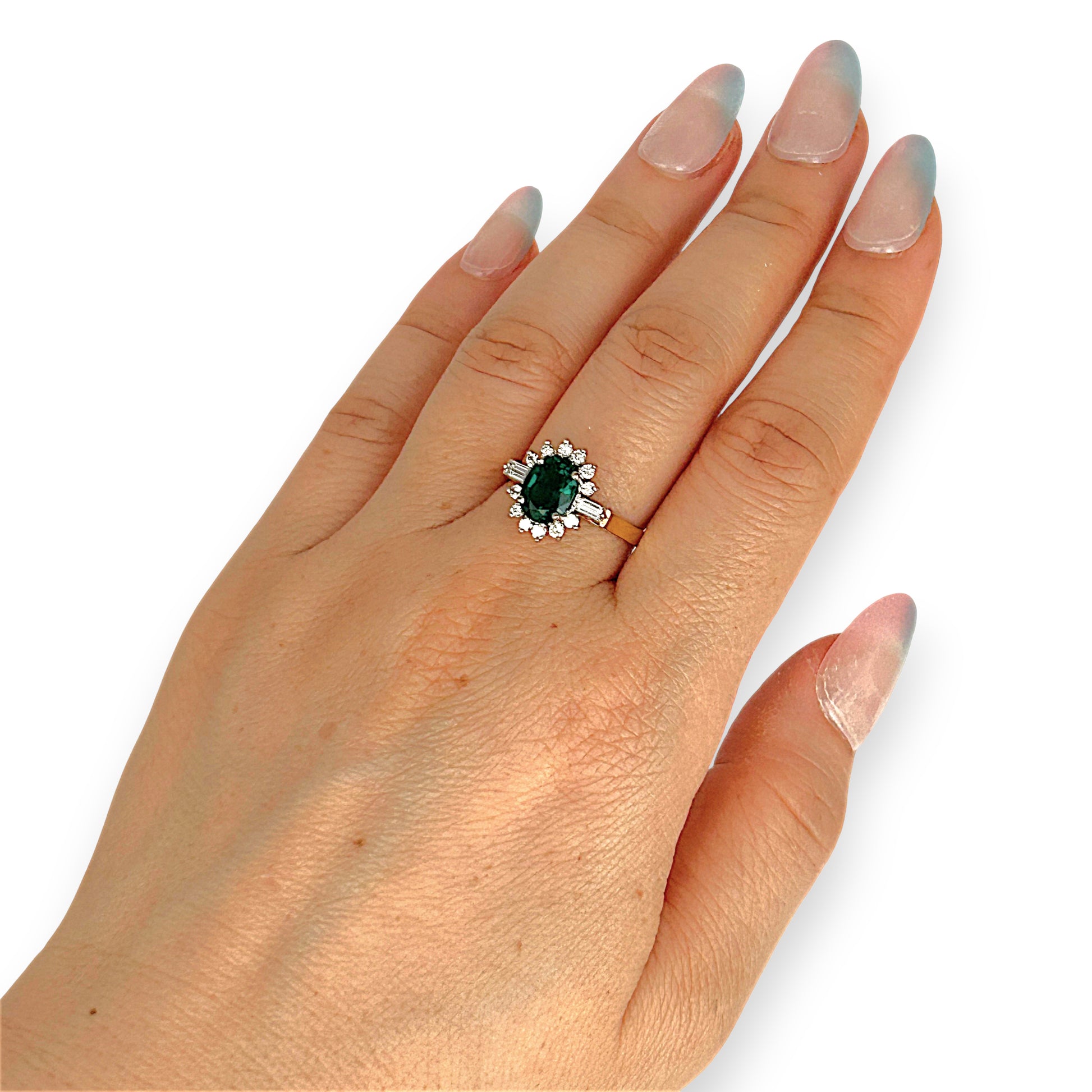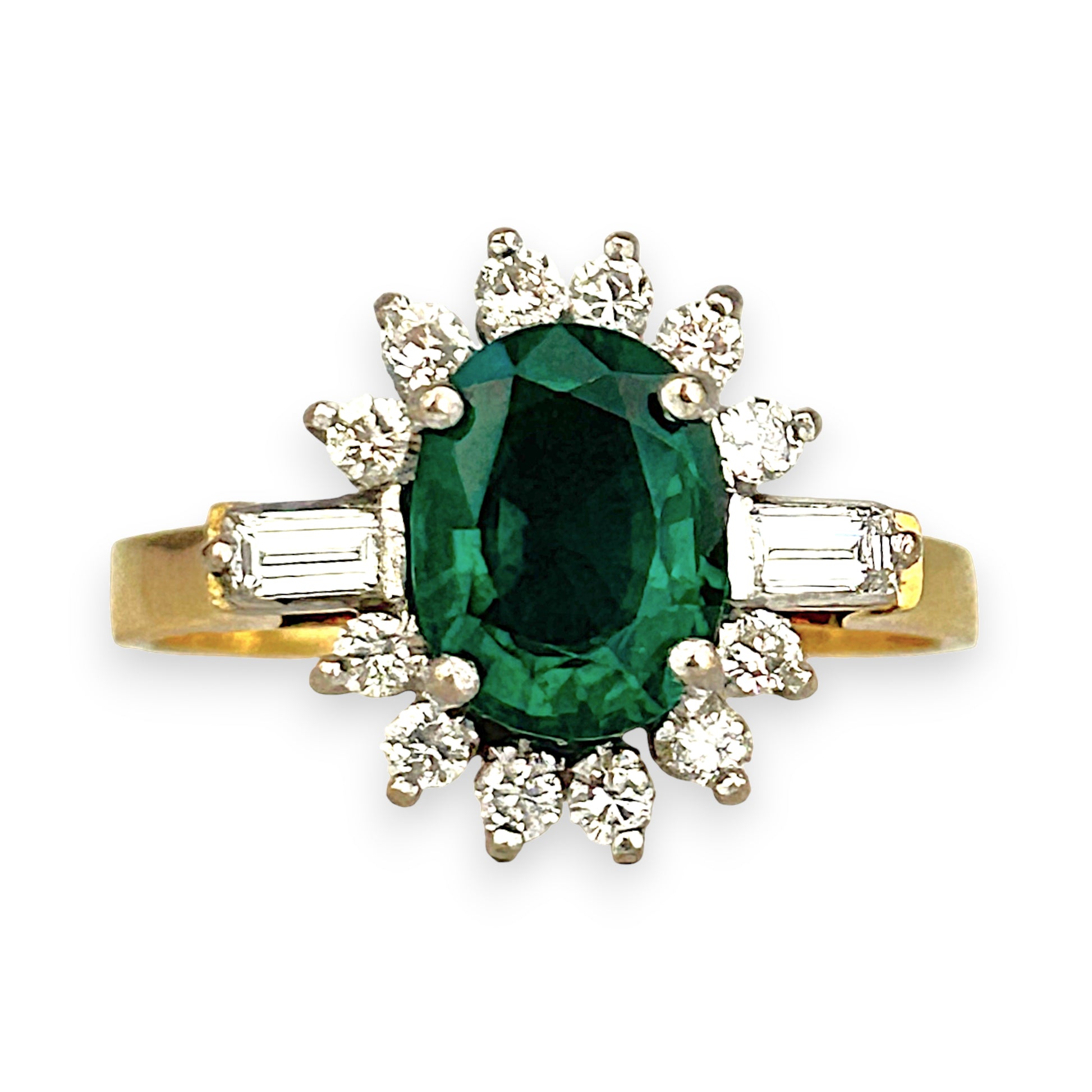 A captivating 18ct white and yellow gold ring featuring a vivid lab-grown emerald at its heart. Surrounded by natural diamonds in a harmonious mix of round and baguette cuts, this design radiates timeless sophistication. Perfect for those who seek luxury with a modern, sustainable touch.
