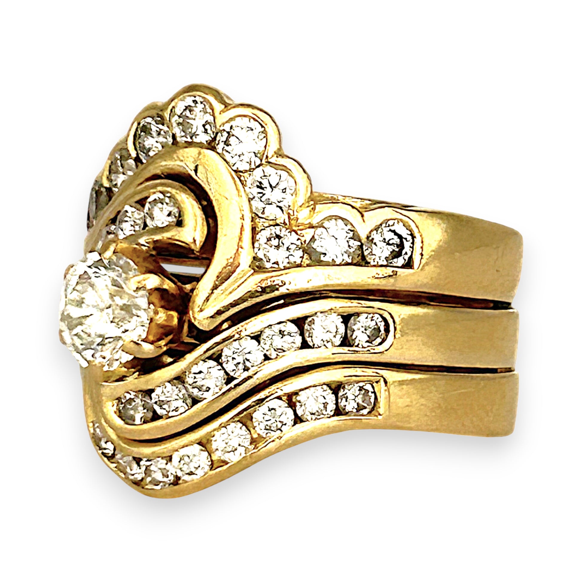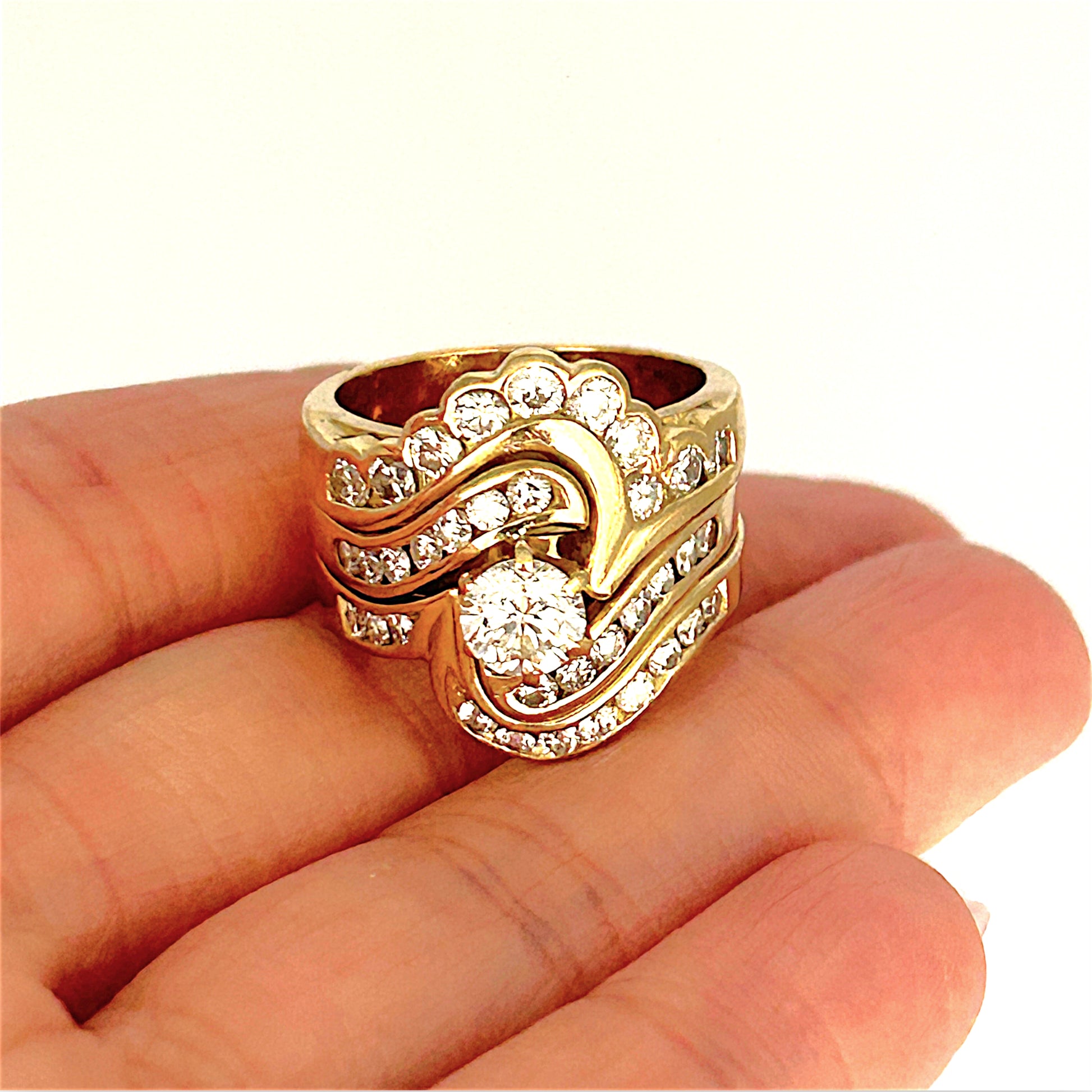This ornate 18ct gold ring features a captivating central round diamond, framed by wave-like rows of smaller diamonds that flow seamlessly across the layered band. The scalloped edges add a touch of elegance and uniqueness, enhancing the ring’s luxurious appeal. With its intricate craftsmanship and radiant sparkle, this piece is perfect for those seeking timeless beauty and smart investment in enduring luxury."