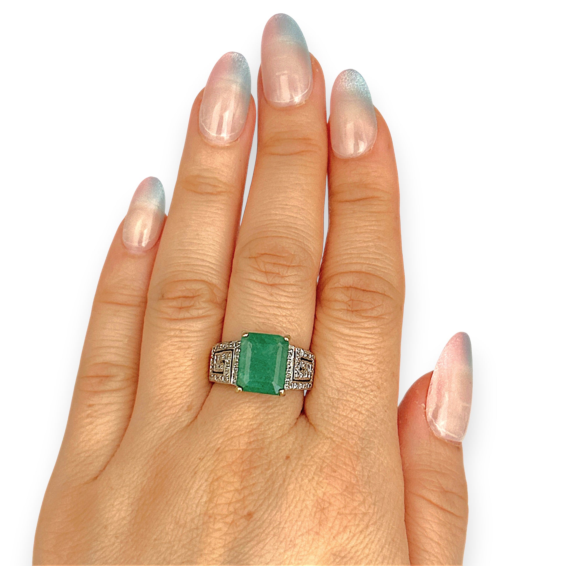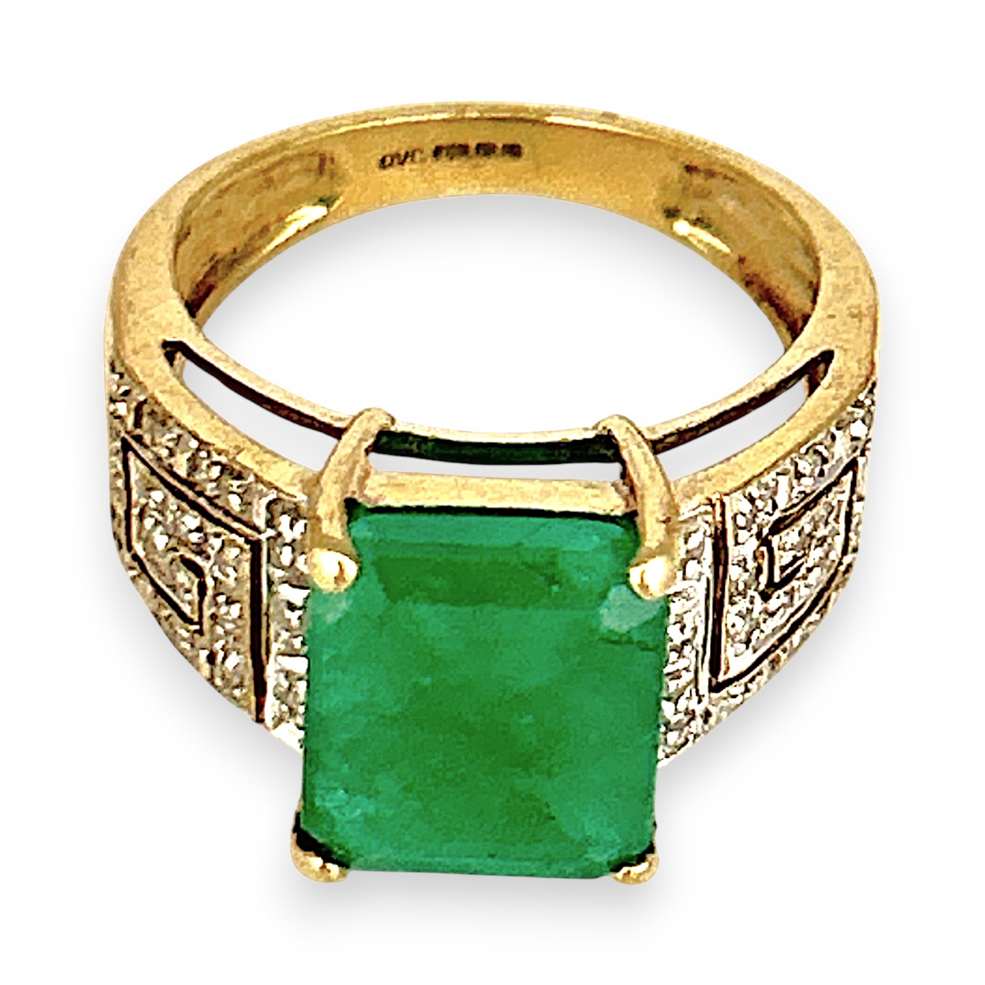 A bold and luxurious statement piece, this ring showcases a vibrant natural emerald in a striking rectangular cut, framed by a geometric arrangement of sparkling diamonds. Crafted in 9ct gold, its intricate design blends classic elegance with modern sophistication, making it a perfect choice for collectors and those who appreciate timeless beauty.