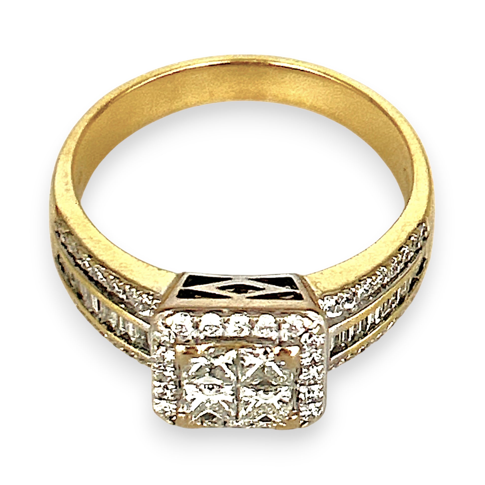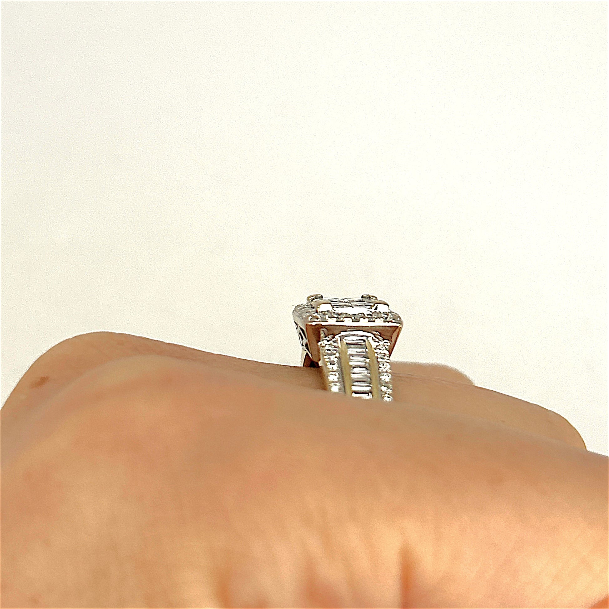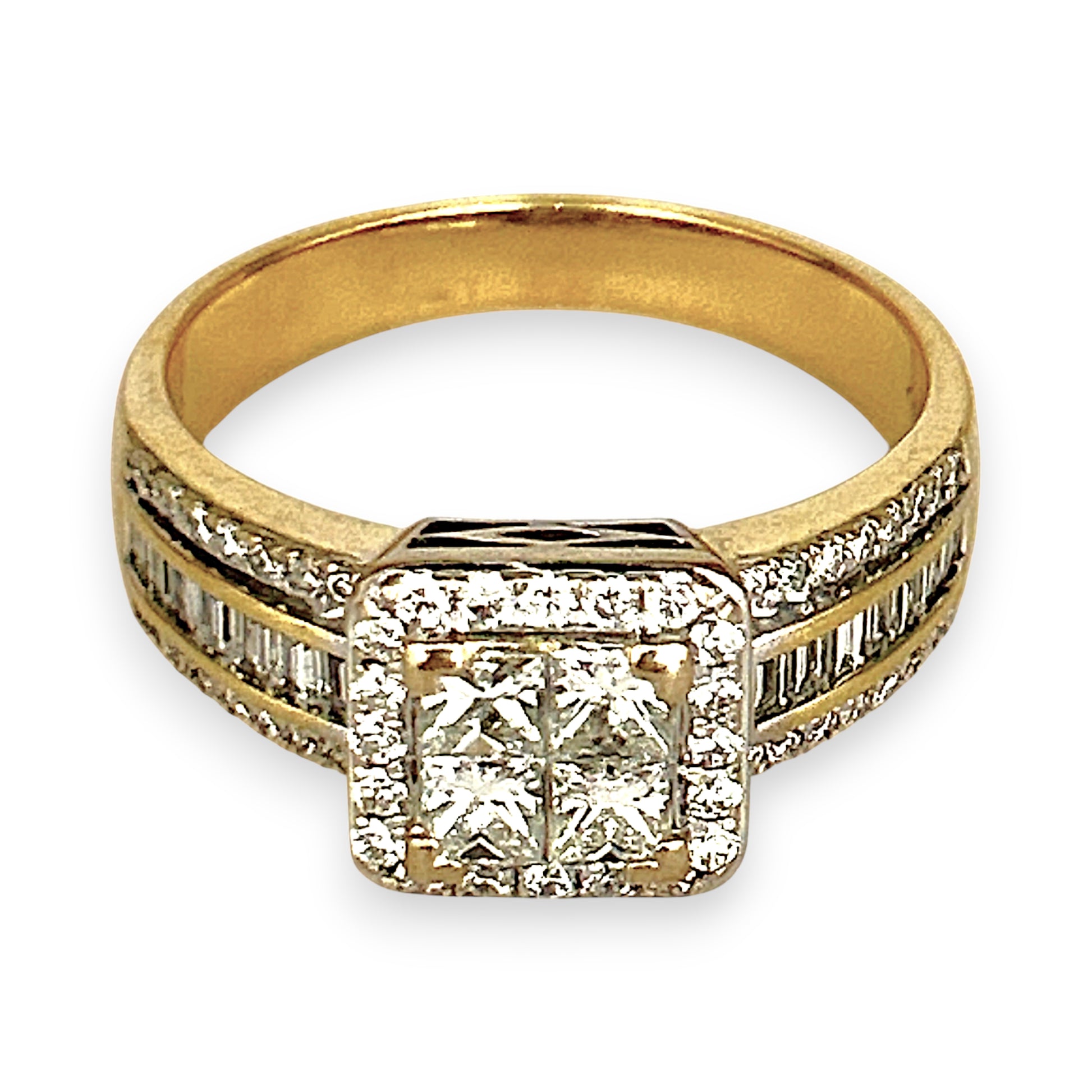 A bold expression of brilliance, this 18ct gold ring showcases a striking square cluster of natural diamonds, including princess, baguette, and round cuts arranged in perfect harmony. With a total diamond weight of 1.70ct, this piece radiates elegance and architectural beauty. A smart investment in timeless luxury and exceptional craftsmanship.