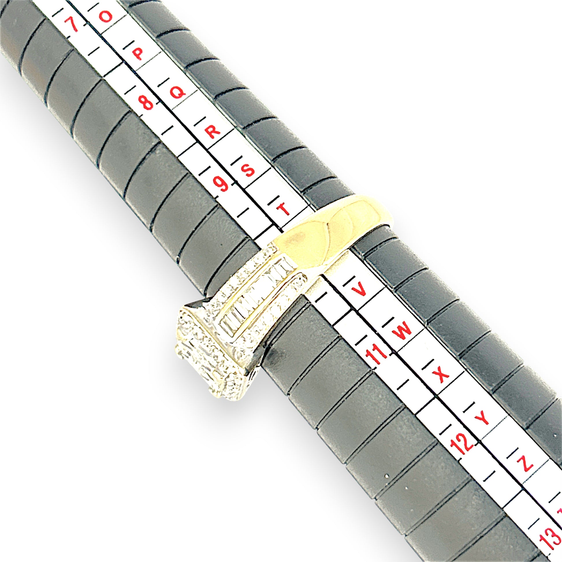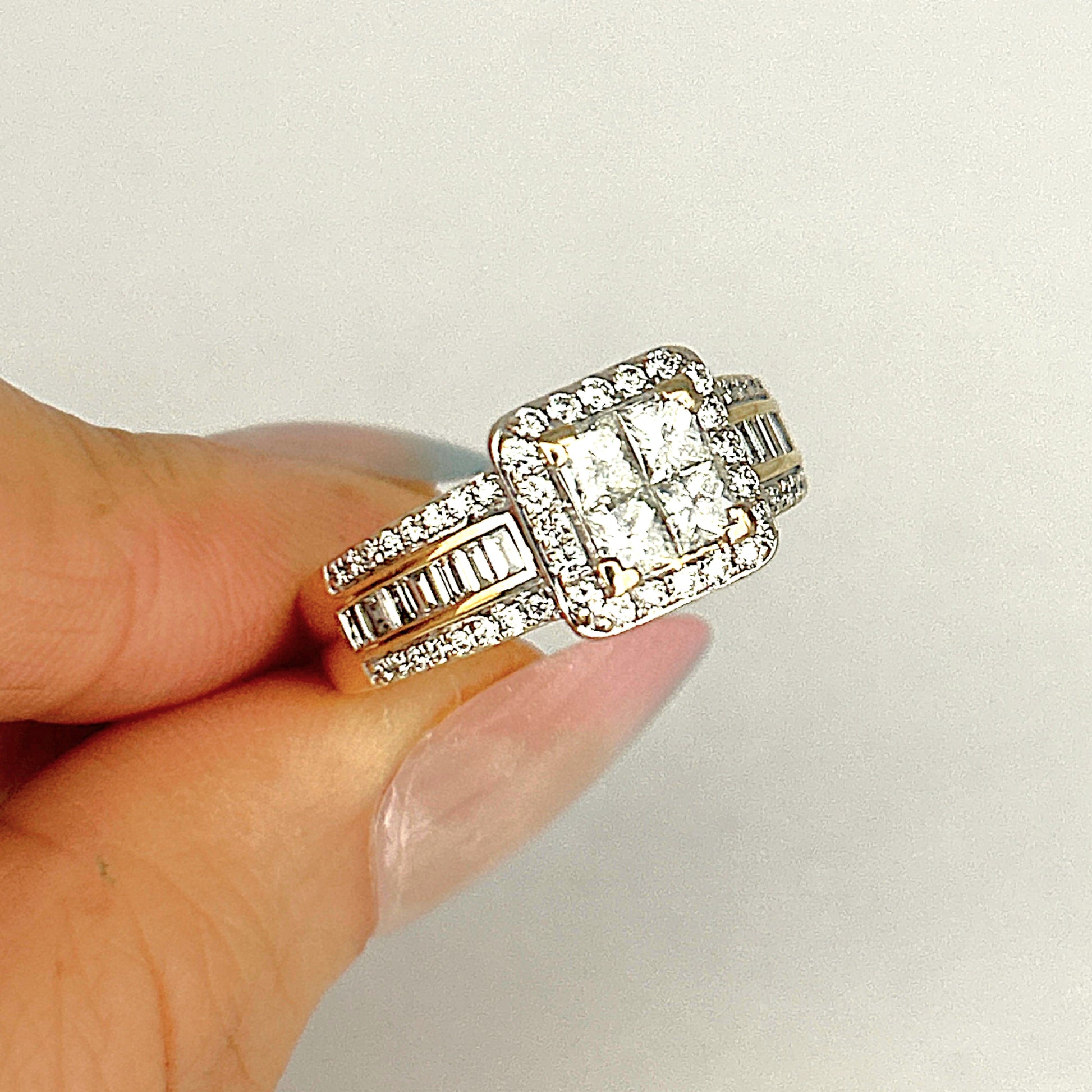 - Stone: Natural Diamonds 4 princess cut & 14 baguette cut & 52 round brilliant cut. TDW 1.70ct.