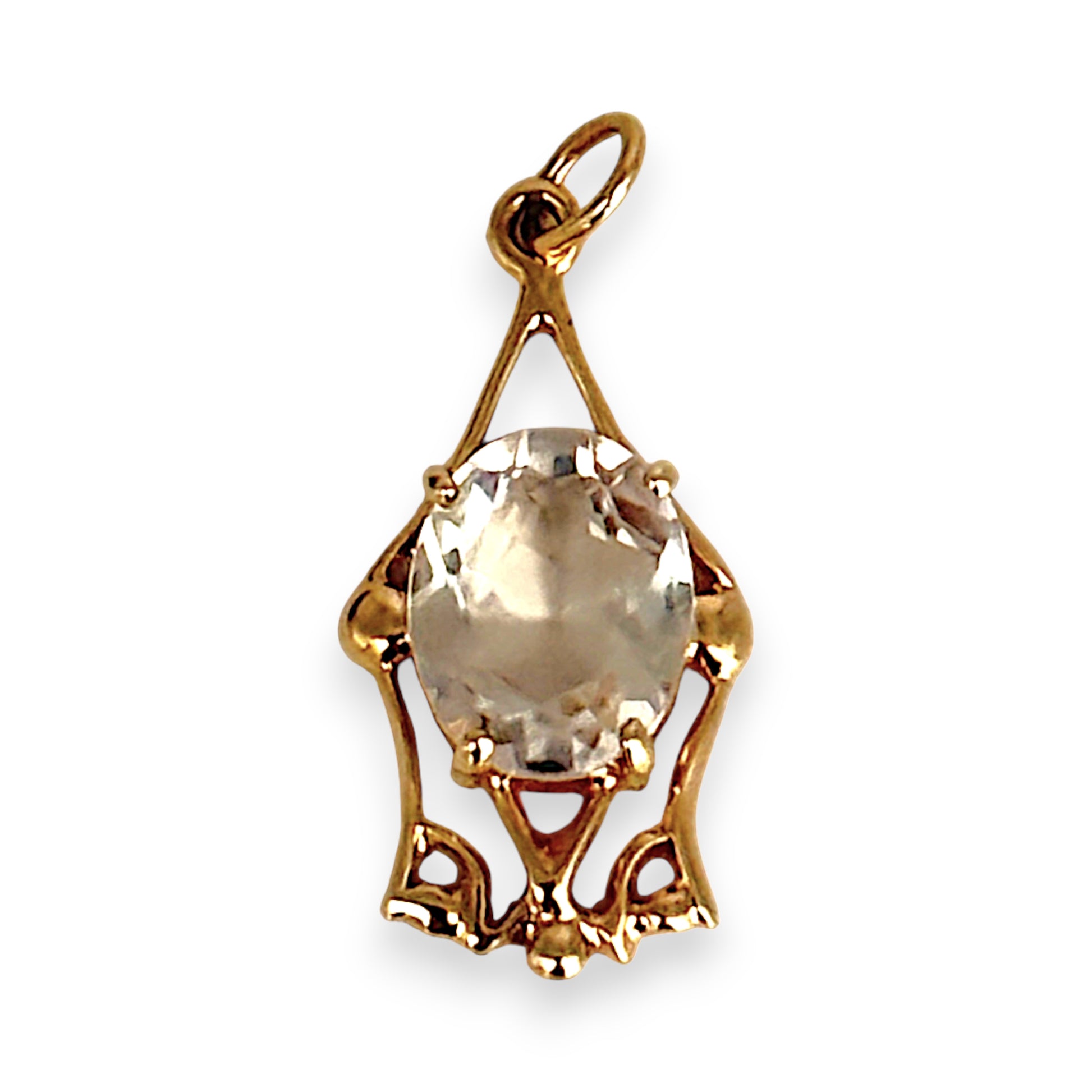 Crafted in 9kt gold, this elegant pendant showcases a clear cubic zirconia in a vintage-inspired frame. Intricate gold detailing adds charm and sophistication to its timeless silhouette. A radiant piece for everyday wear or special occasions