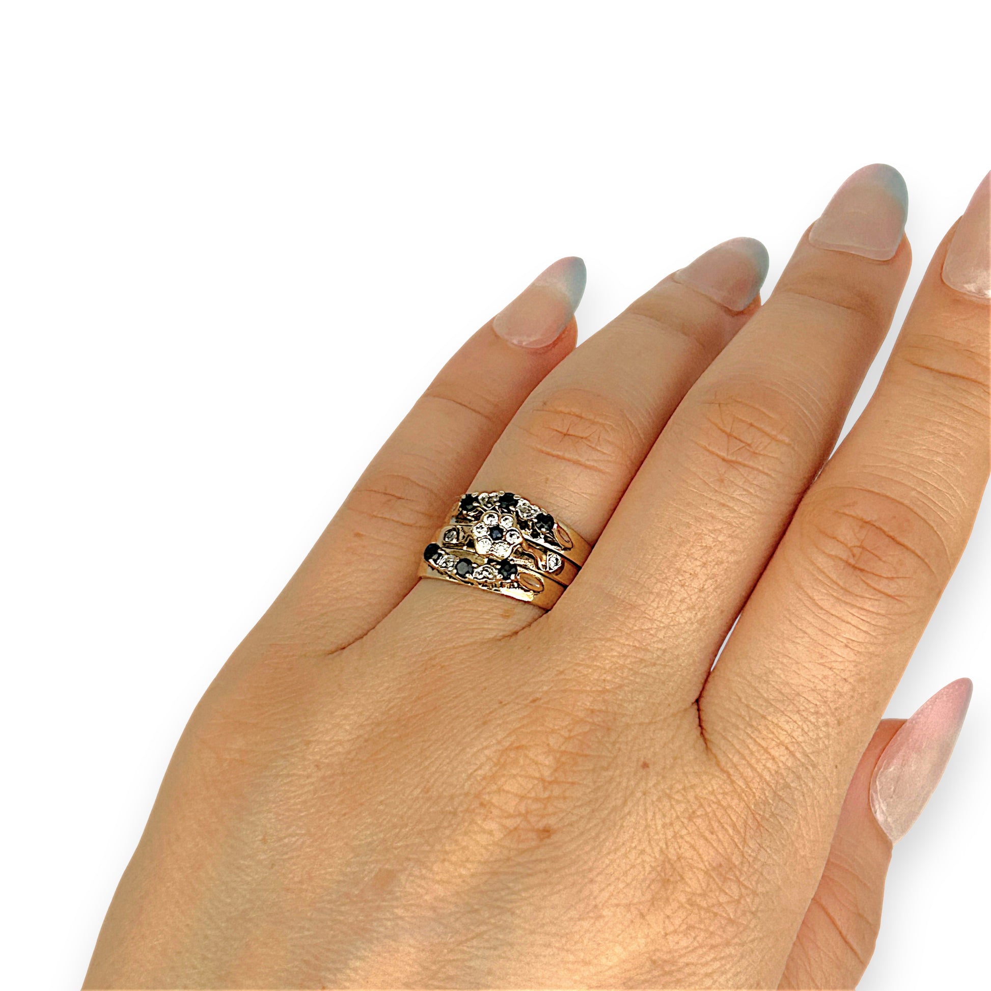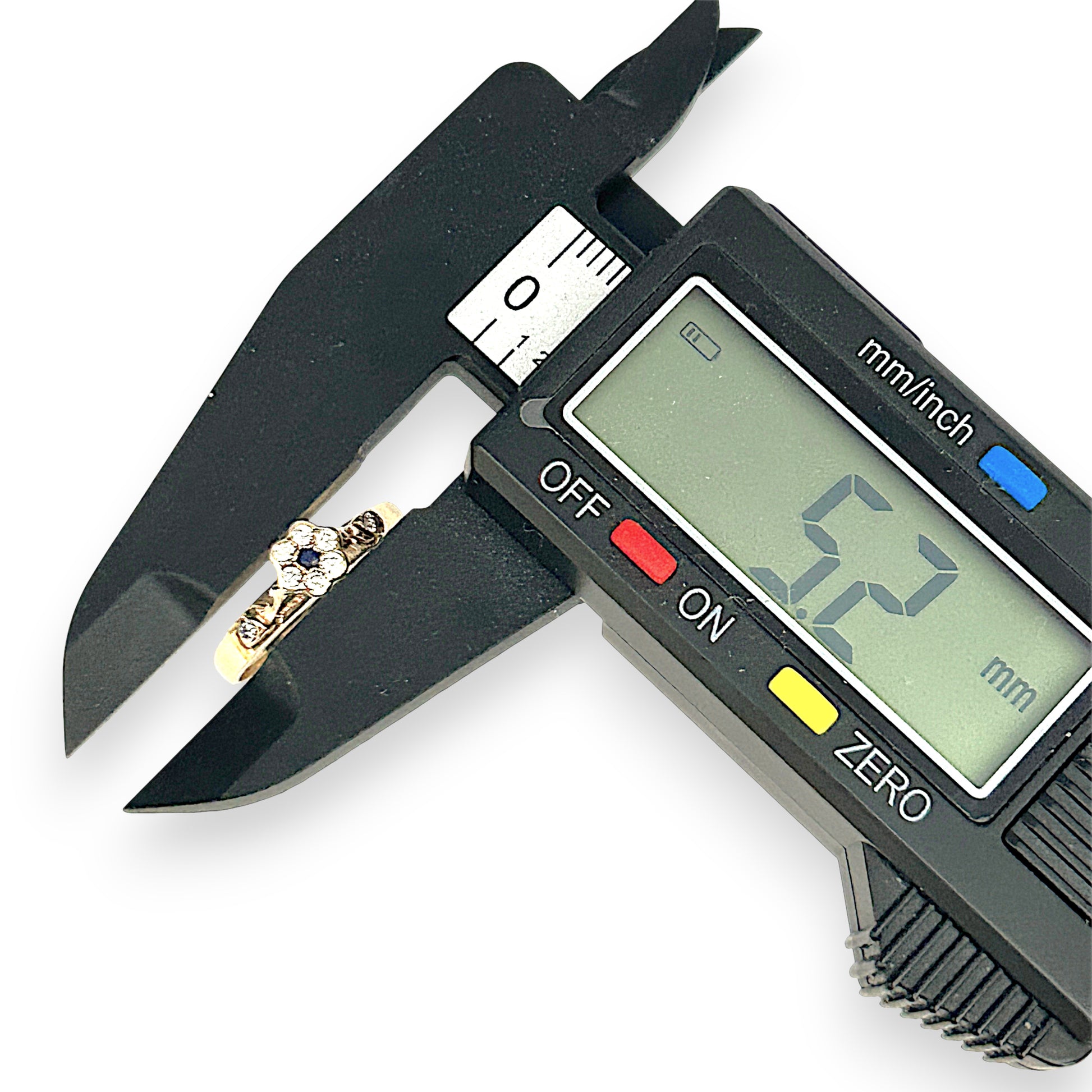 This radiant trio of 9kt gold rings blends modern brilliance with timeless charm. Each piece showcases lab-grown sapphires and sparkling cubic zirconia, arranged in bold and graceful motifs. Perfect for stacking or solo wear, this set offers versatile glamour with a refined edge