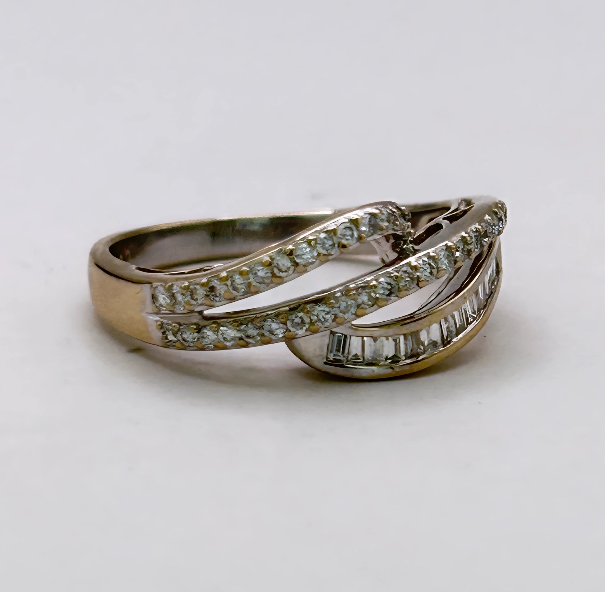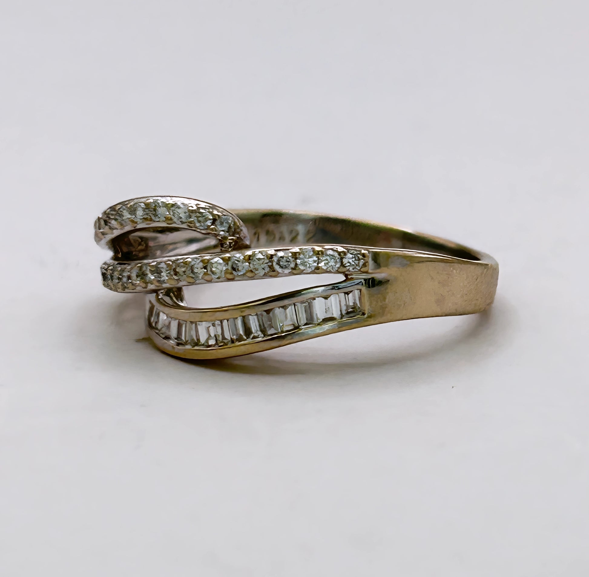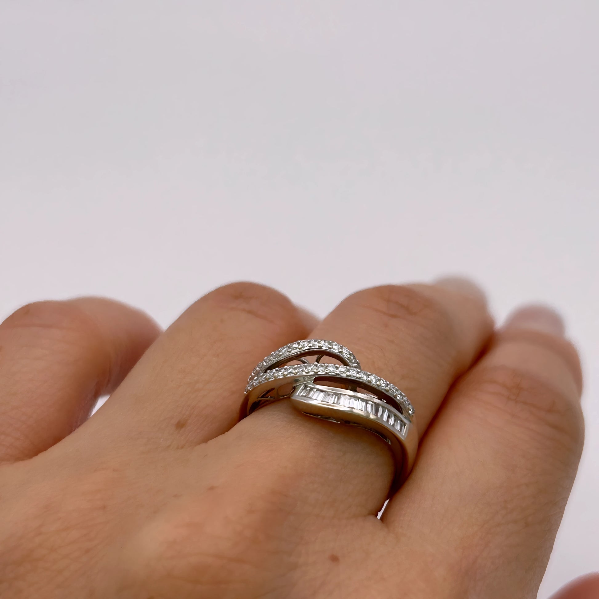 A beautifully crafted 18kt white gold ring featuring alternating baguette and round natural diamonds in a fluid, interwoven design. The combination of clean lines and shimmering brilliance offers a modern yet timeless aesthetic.