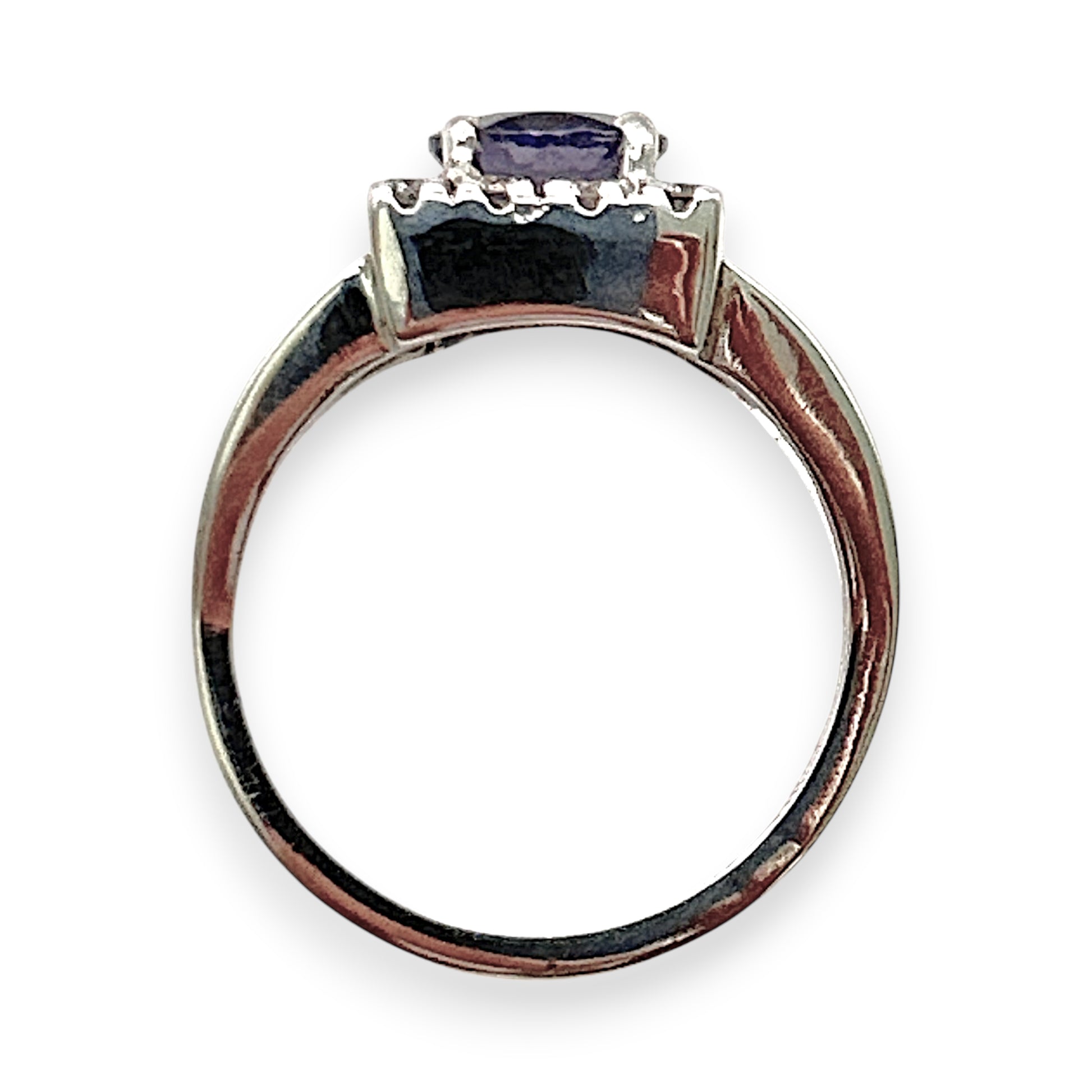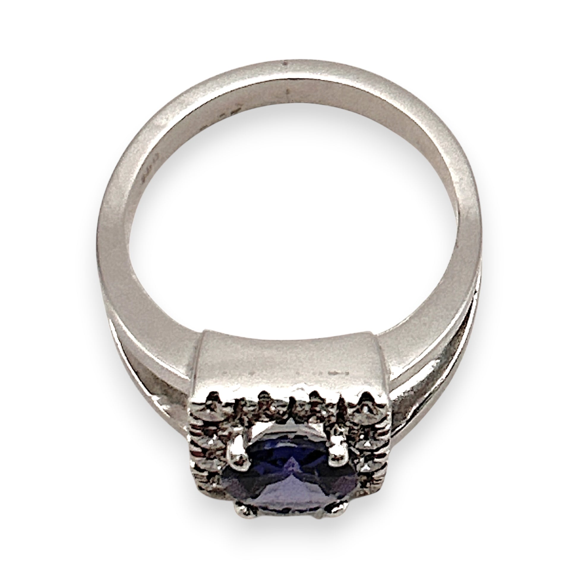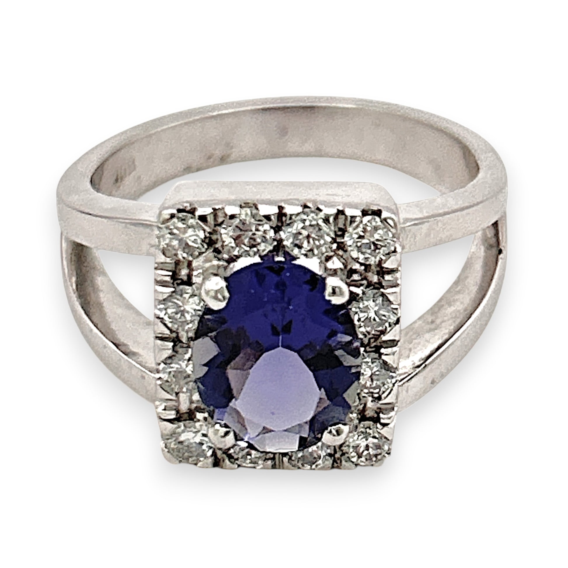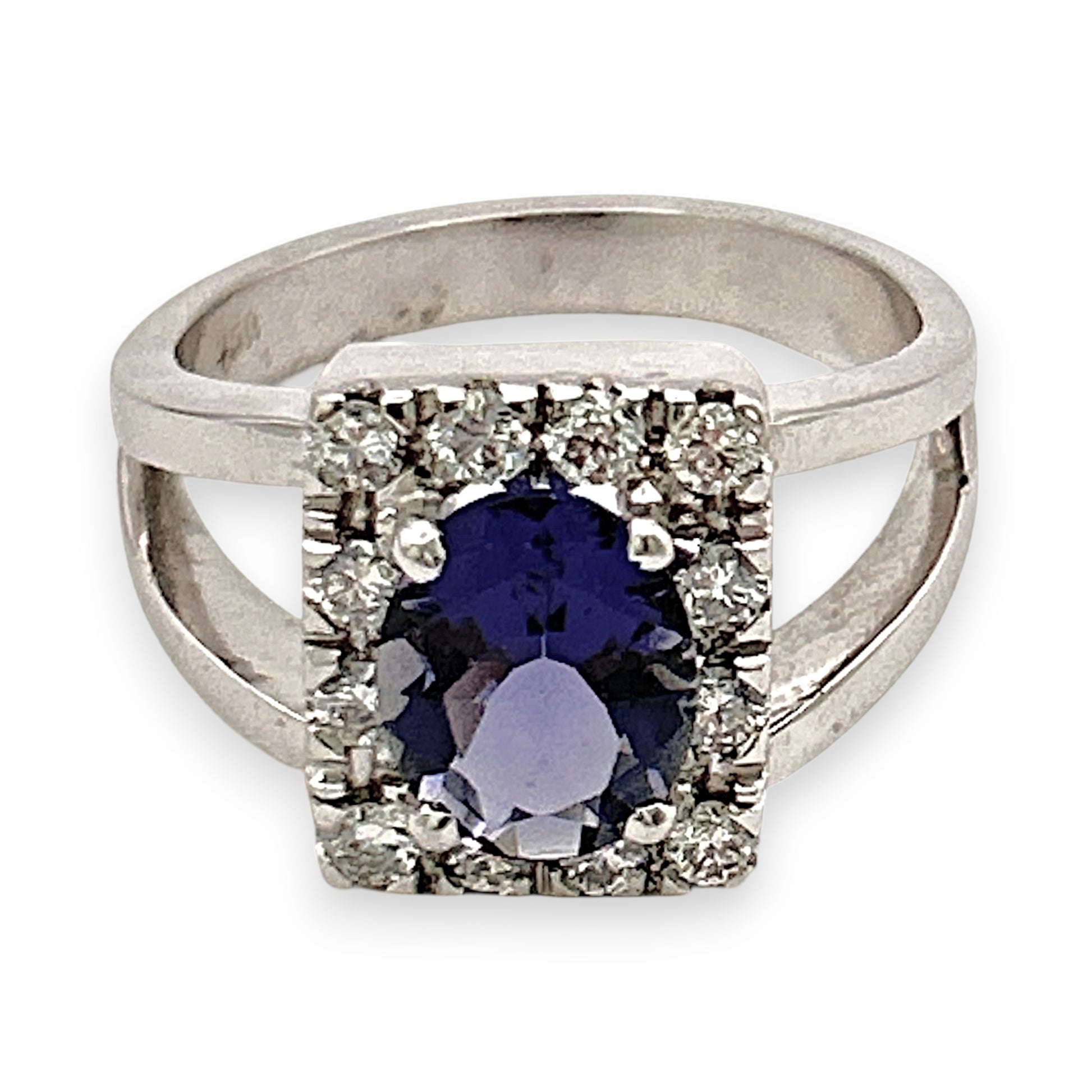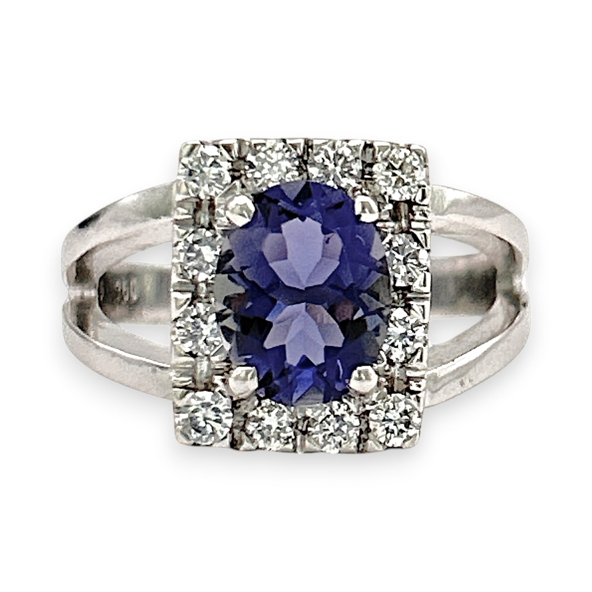 A stunning 18kt white‑gold ring featuring a natural iolite framed in sparkling diamonds, crafted with boutique‑level elegance.