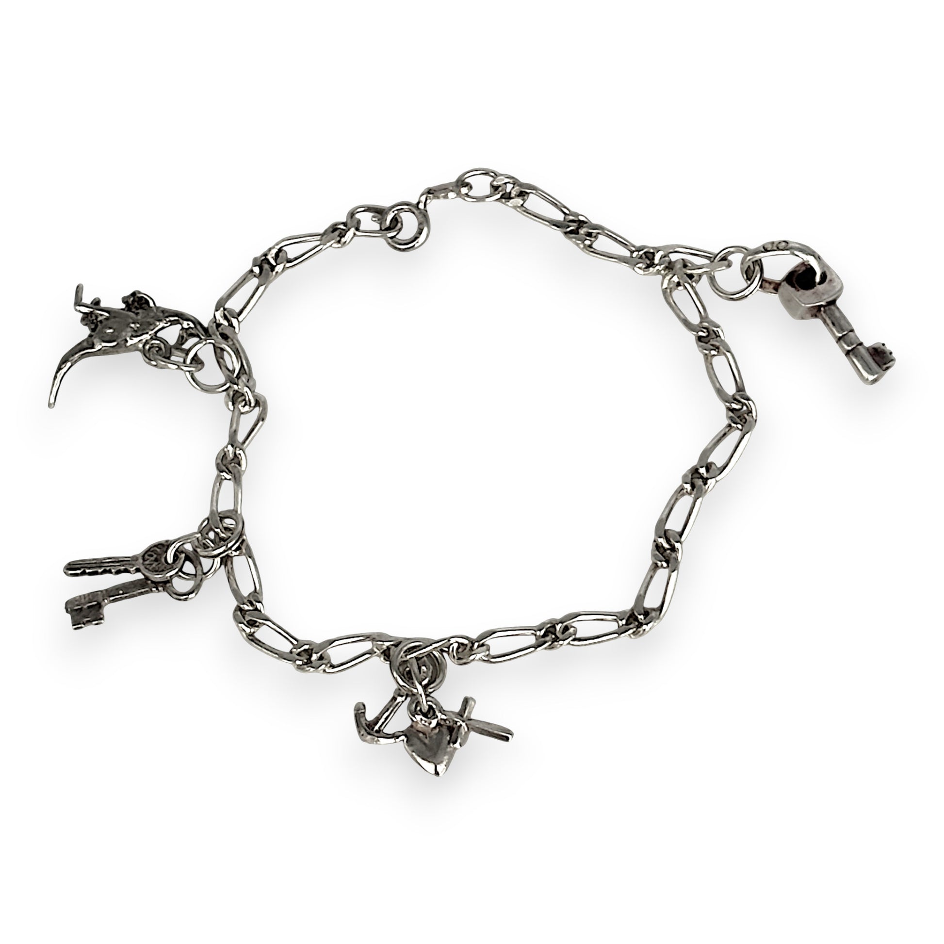 A stylish 1x3 Figaro chain bracelet in silver, featuring five unique charms: key, kangaroo, anchor, cross, and heart. Perfect for adding personality and elegance to any look.