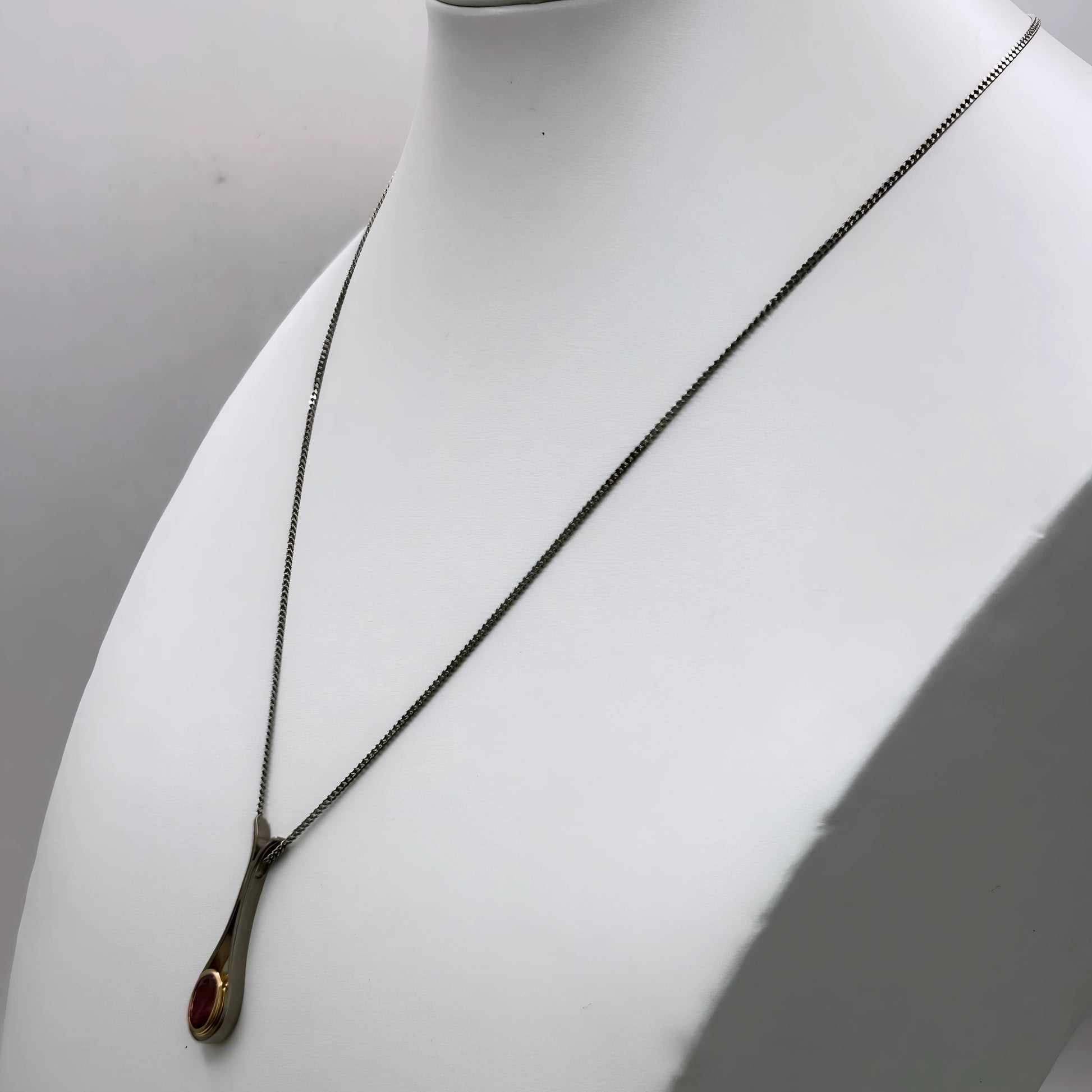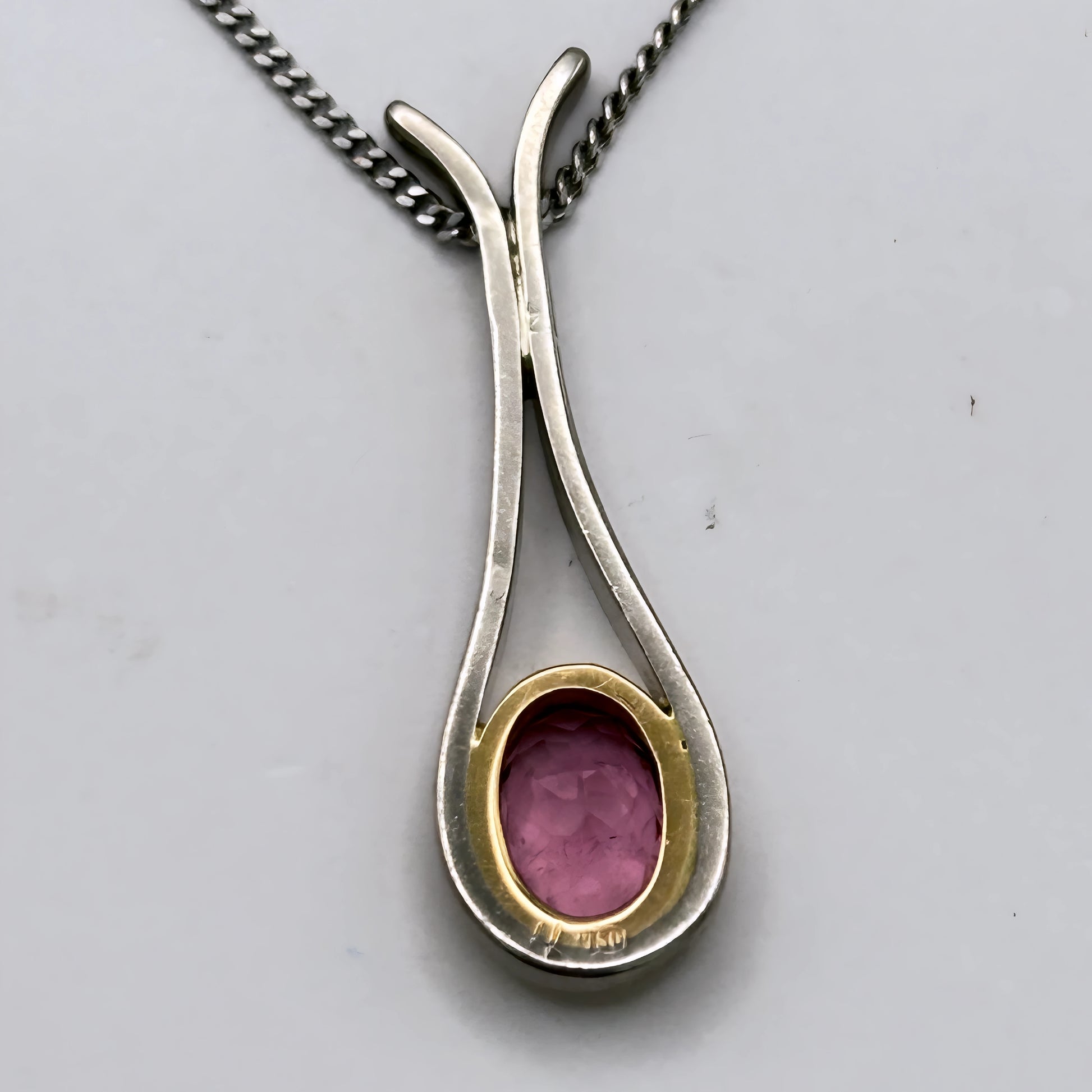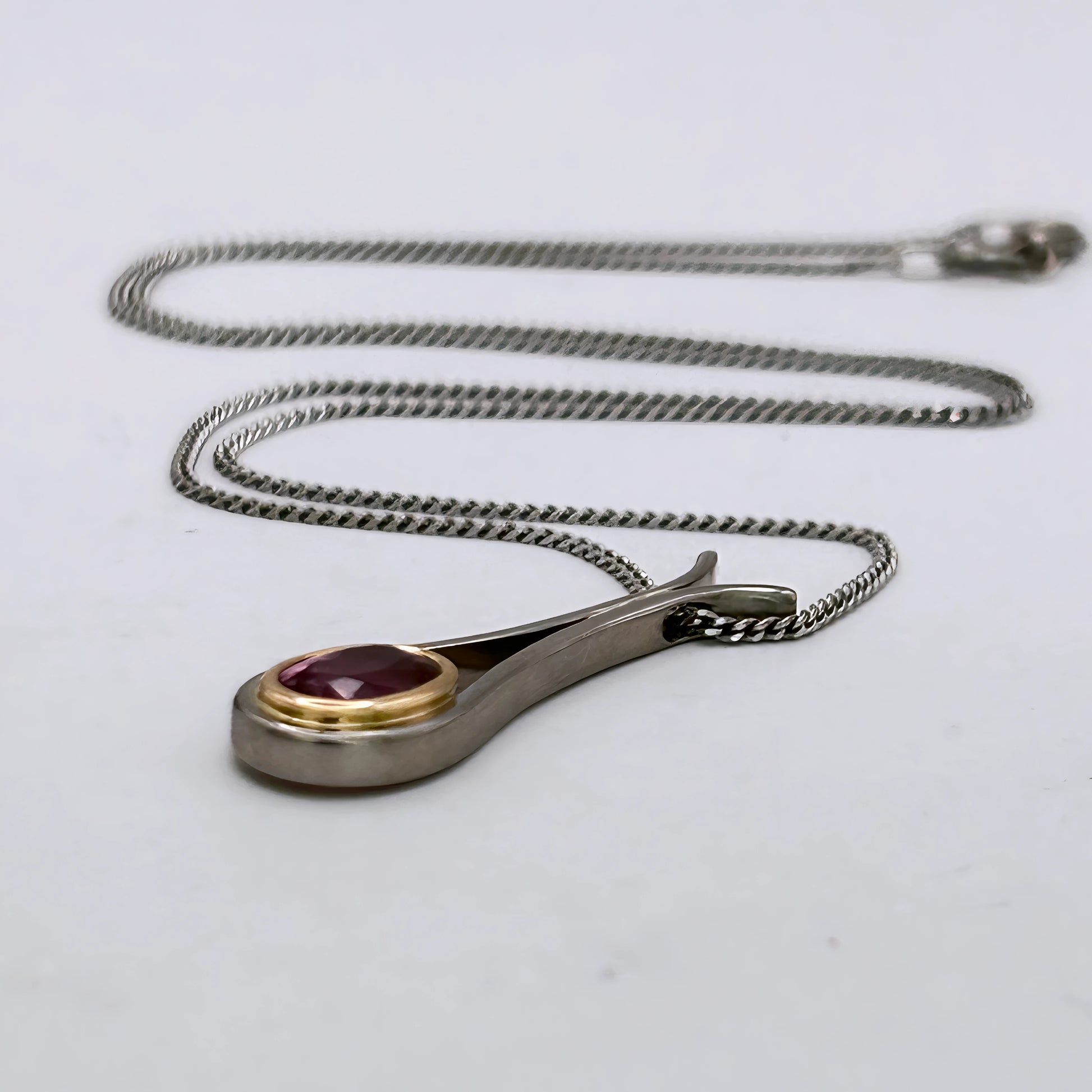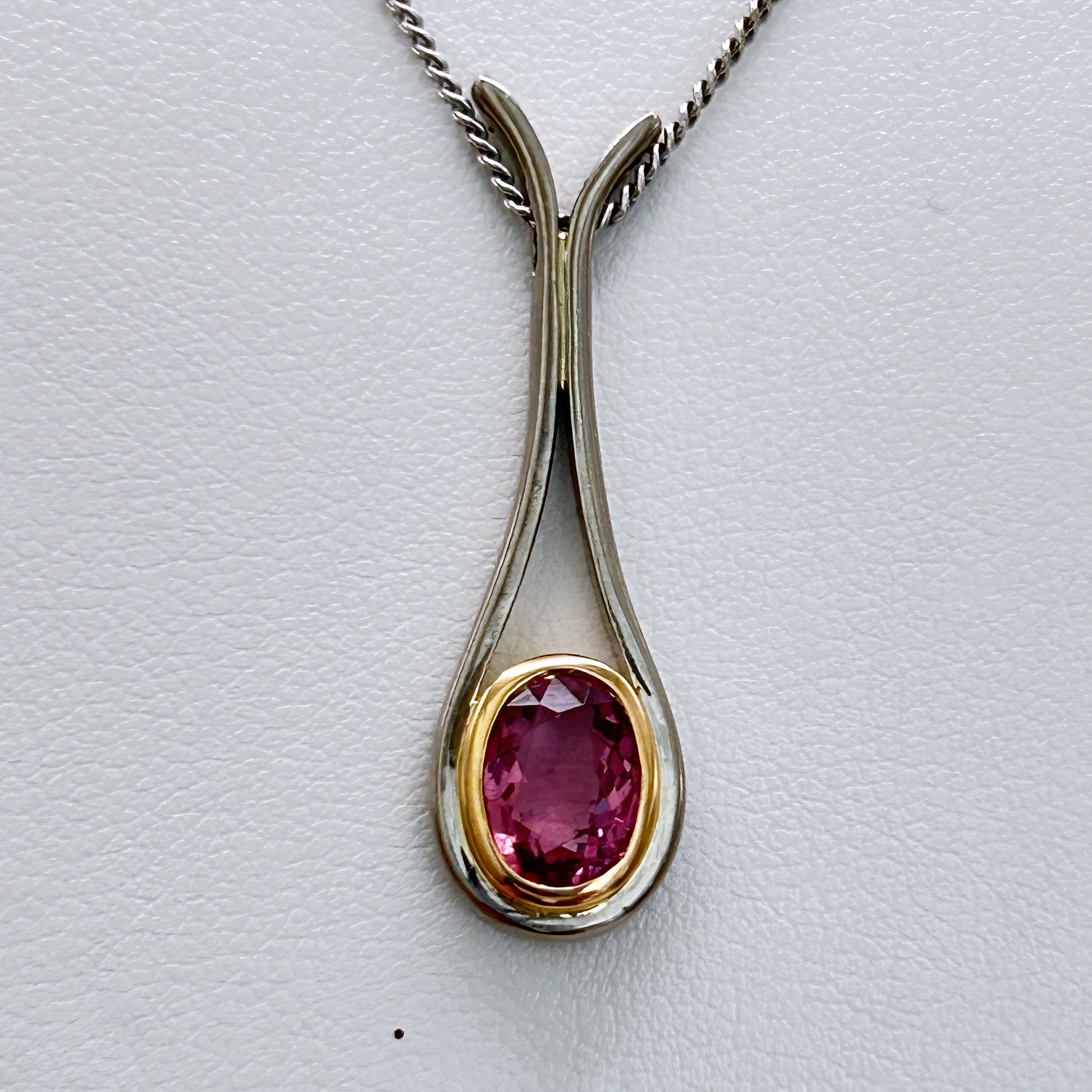 An 18kt white‑gold fine curb chain crafted strong, solid, and refined for everyday elegance. The pendant pairs 18kt yellow and white gold with a soft Pink tourmaline, creating a romantic vintage contrast. A one‑of‑a‑kind two‑tone piece that blends strength, charm, and timeless colour.