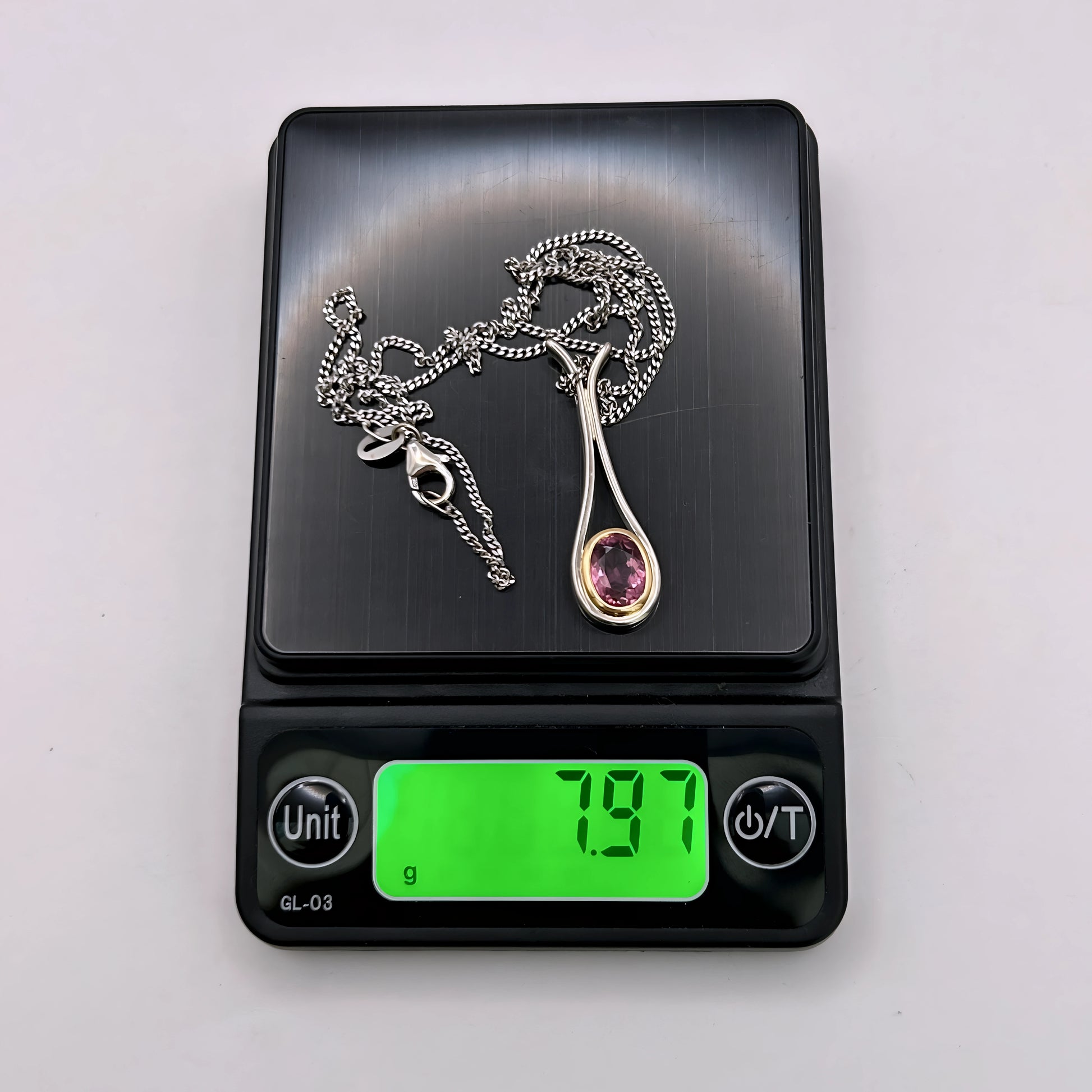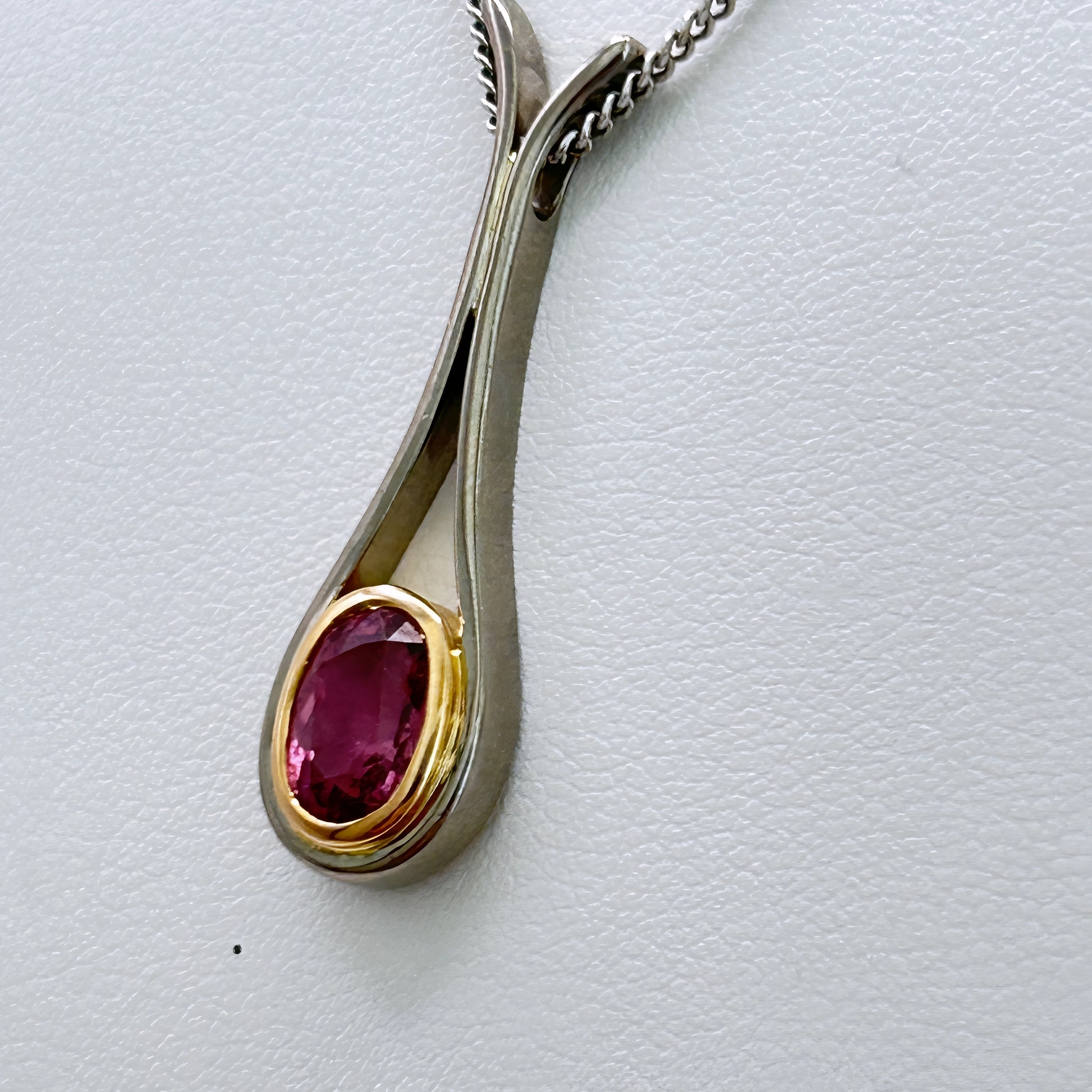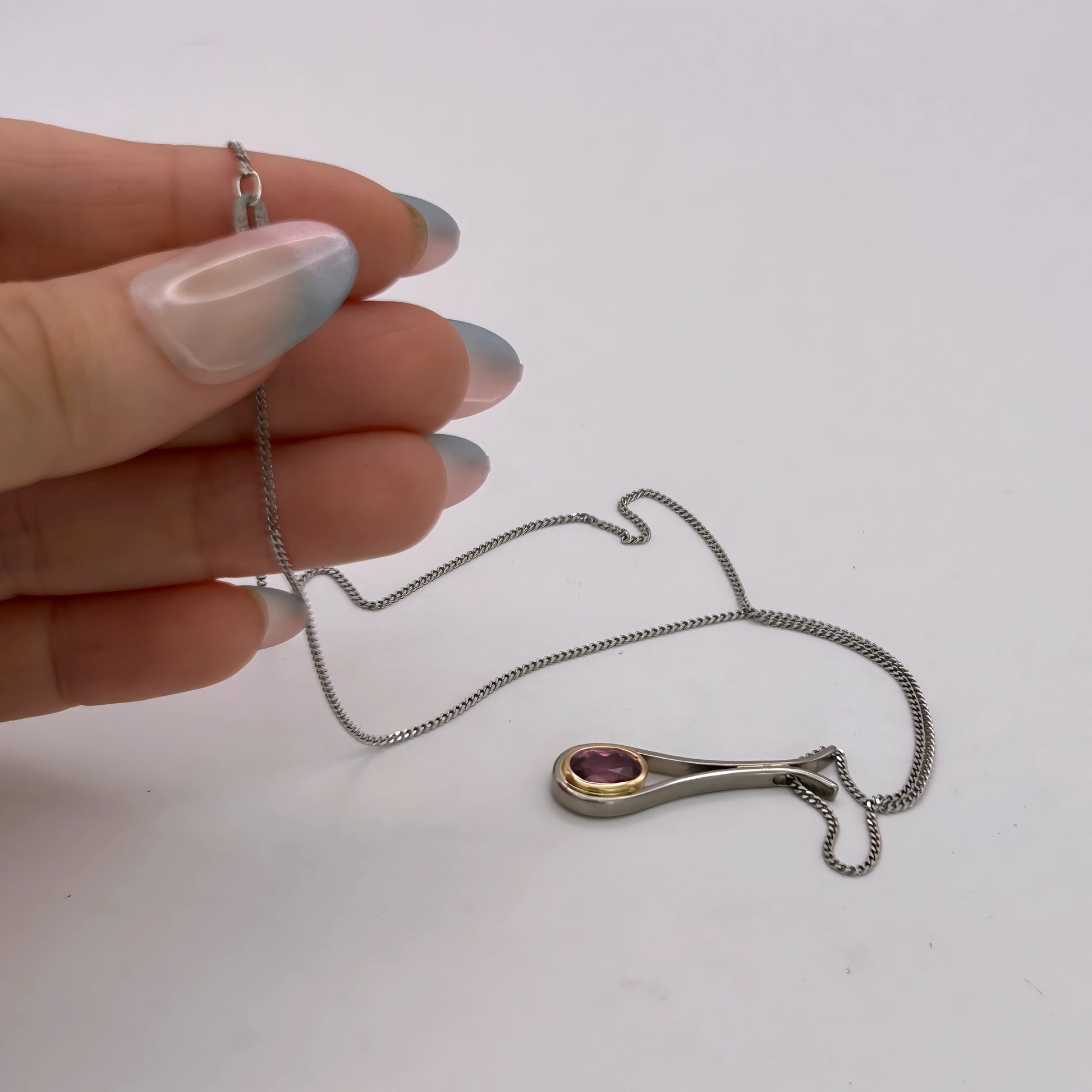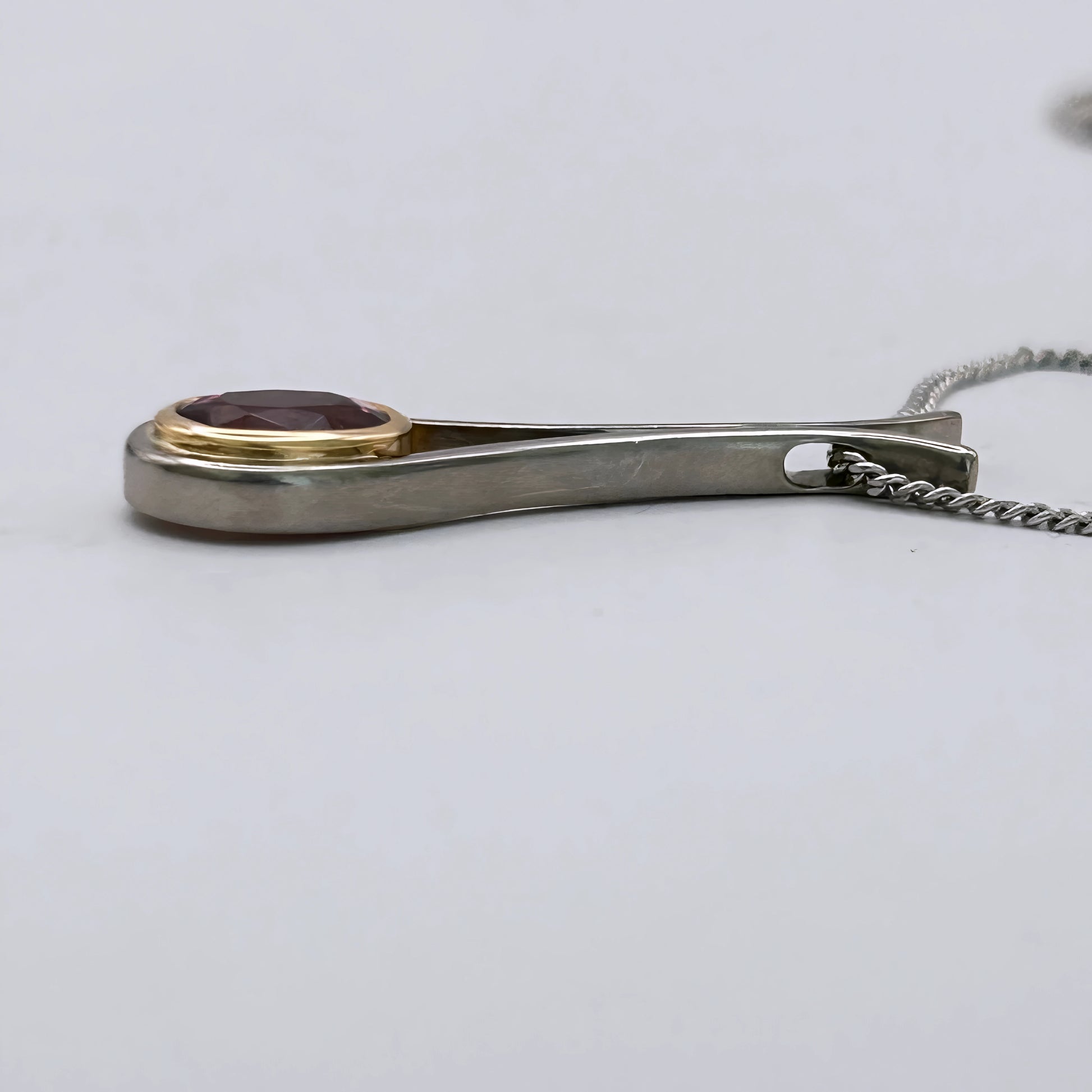 An 18kt white‑gold fine curb chain crafted strong, solid, and refined for everyday elegance. The pendant pairs 18kt yellow and white gold with a soft Pink tourmaline, creating a romantic vintage contrast. A one‑of‑a‑kind two‑tone piece that blends strength, charm, and timeless colour.
