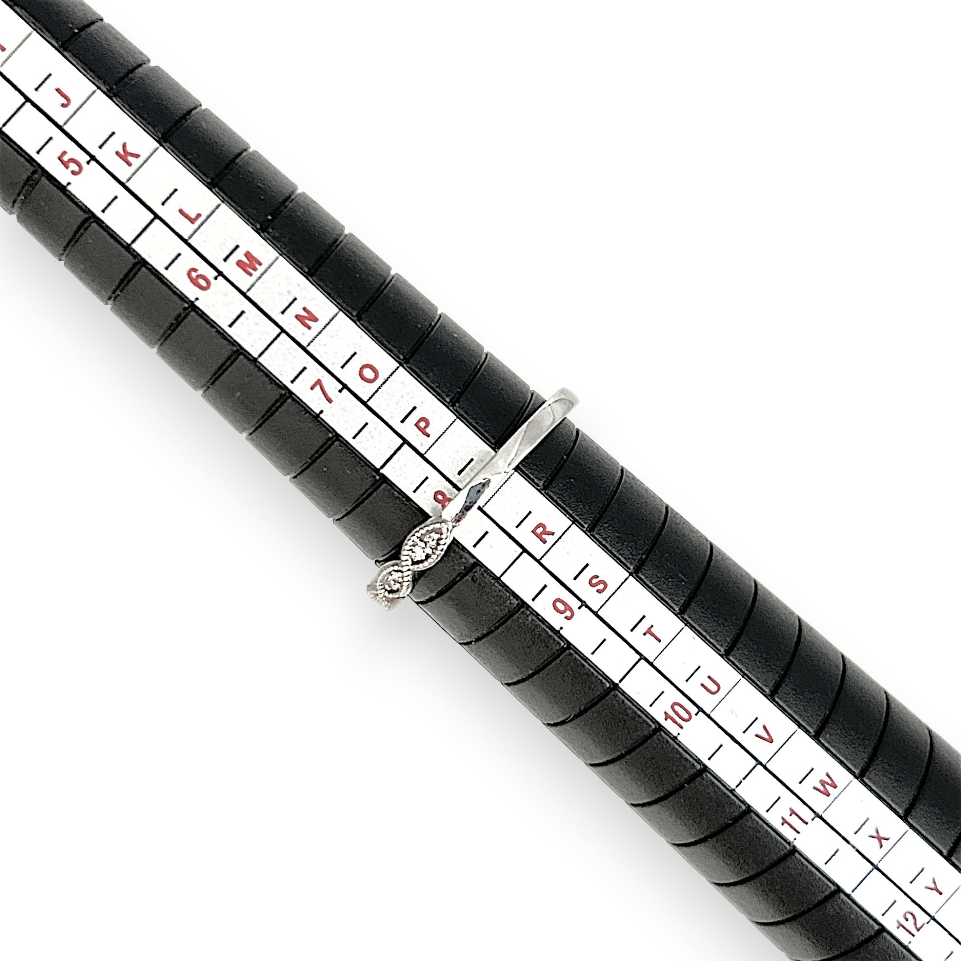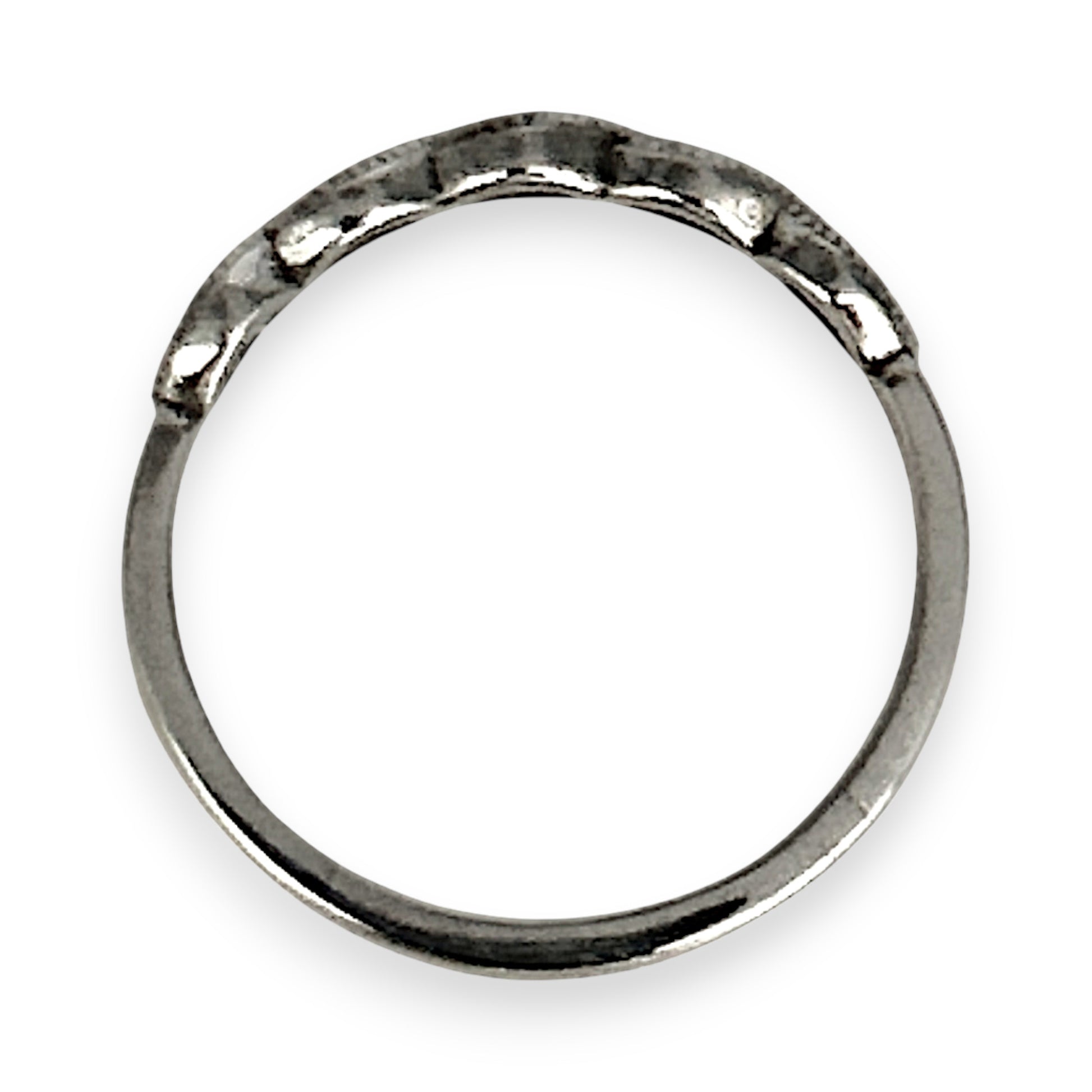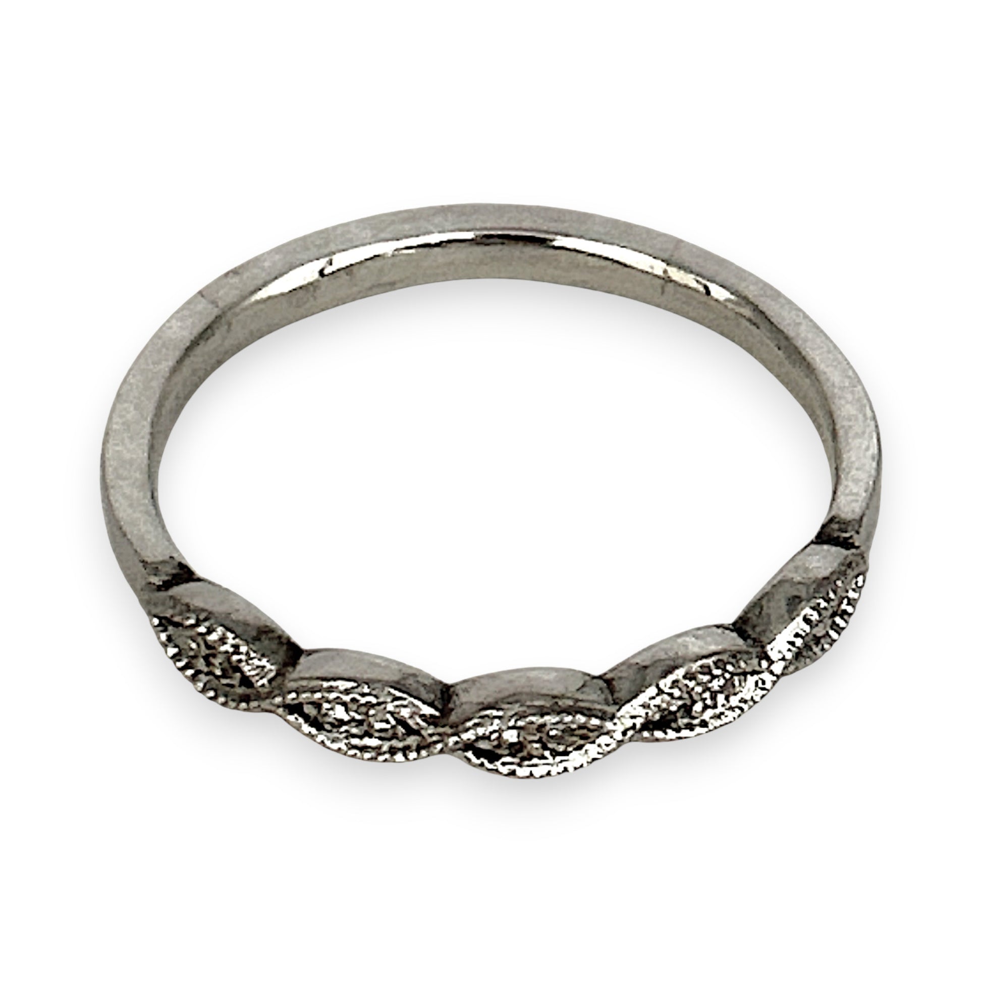 Crafted in luminous white gold, this vintage-inspired ring features a rhythmic pattern of marquise-shaped motifs, each set with a delicate round diamond. Textured edges frame each element, adding depth and antique charm. The symmetrical design flows gracefully around the band, offering understated brilliance. A timeless piece that blends ornamental detail with everyday elegance.